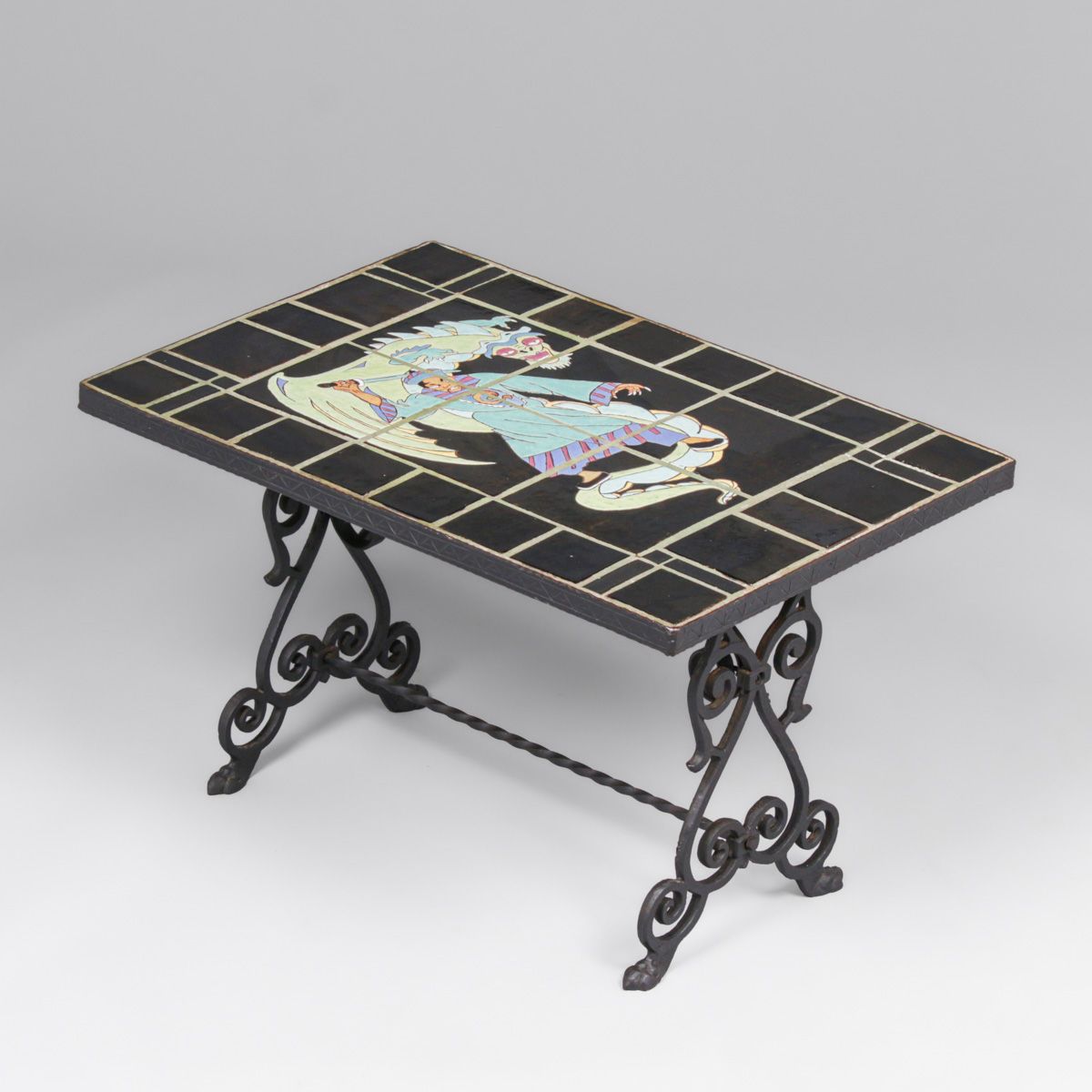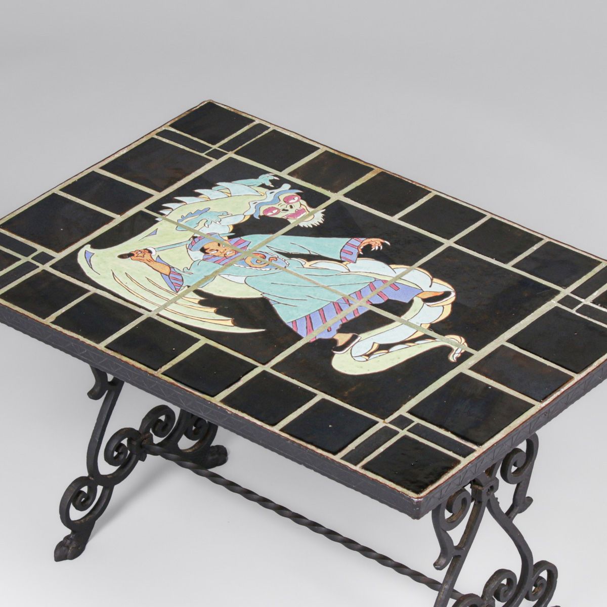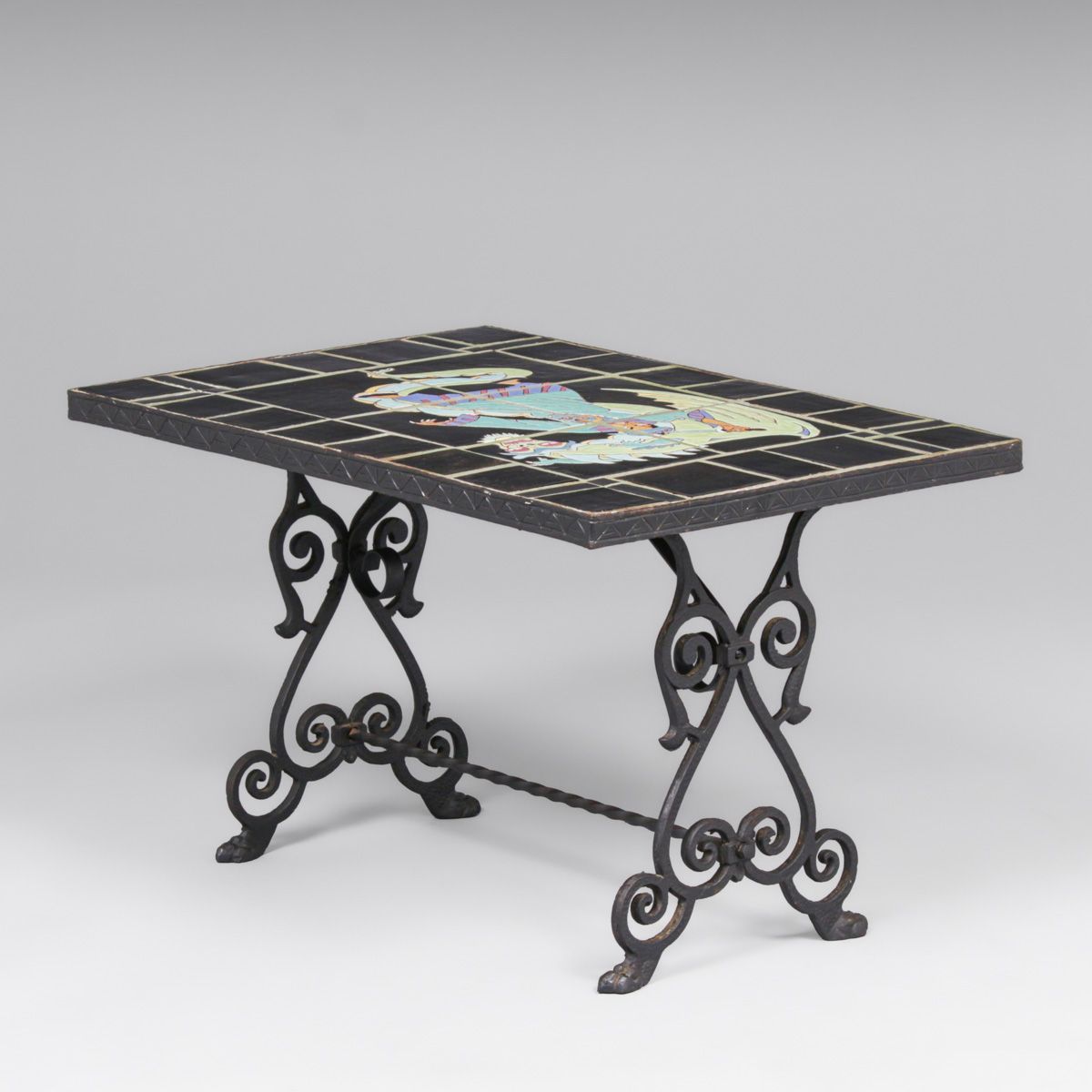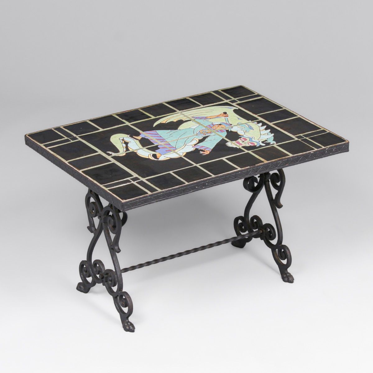 Rare Gladding McBean Samurai & Dragon Tile-Top & Iron Table c1920s. Unsigned. Tiles in near perfect condition. 27.25" x 18.75" x 17"h