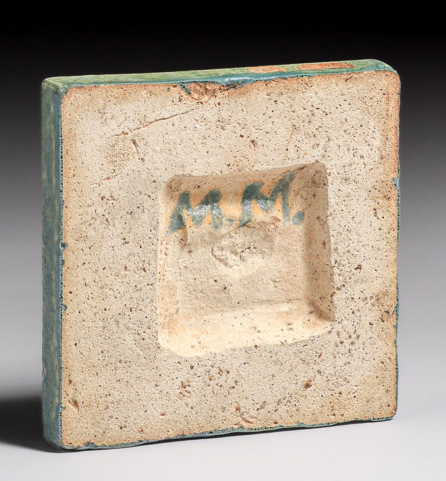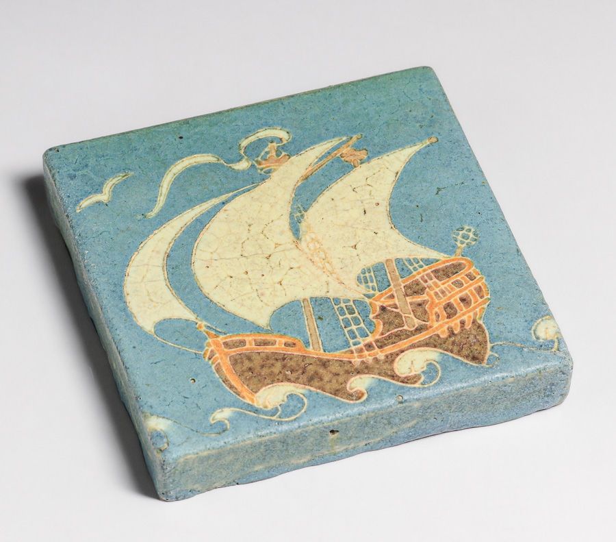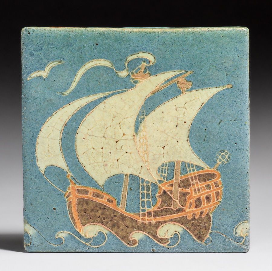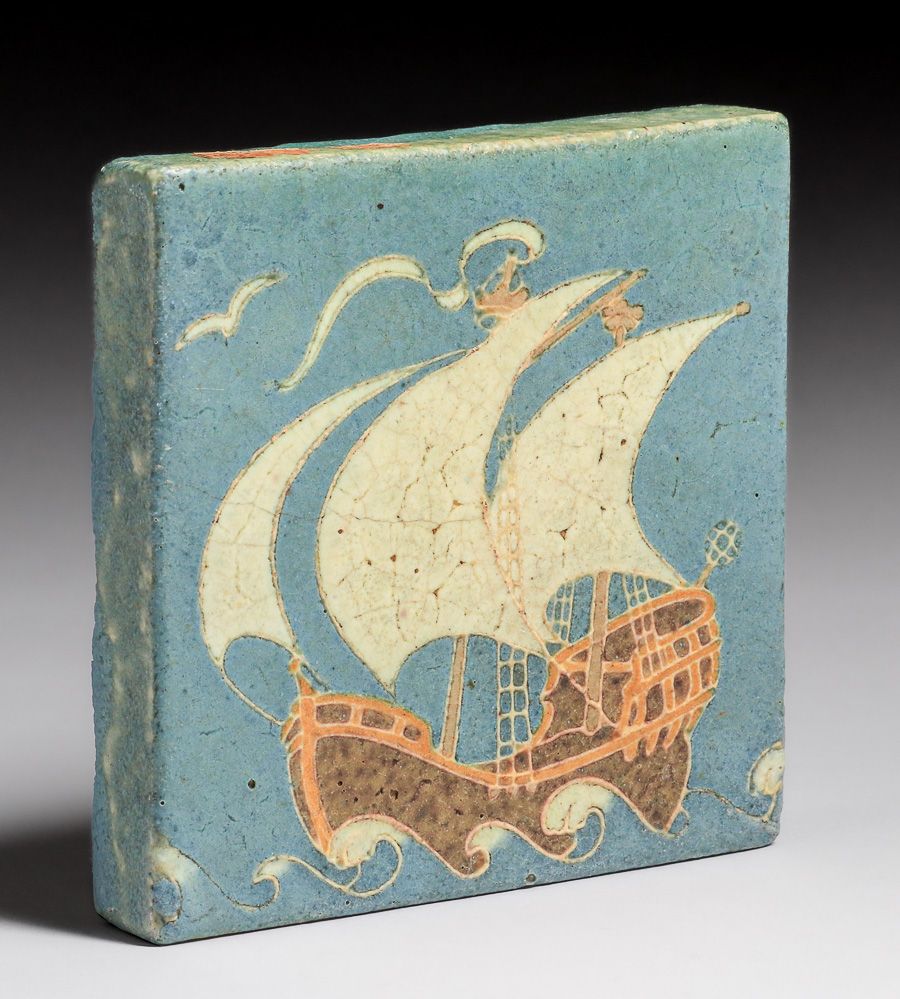 Grueby Faience Galleon Ship Tile c1905. Signed. Invisible professional restoration to small corner chips, otherwise perfect condition. 6" x 6"