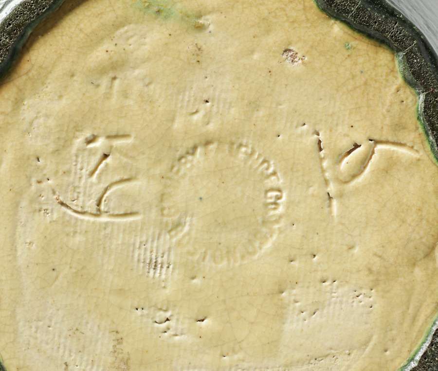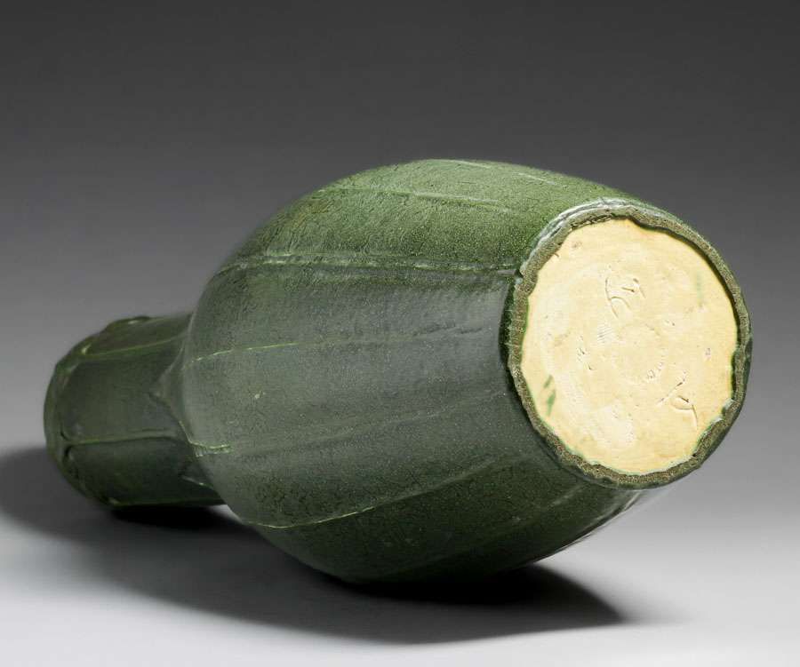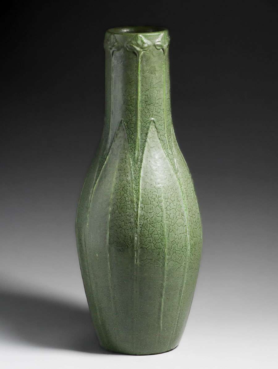 Grueby Faience Matte Green Floor Vase c1905. Crisp leaves and blossoms perfectly fired. Signed. Perfect condition. 23"h x 8.5"d SOLD