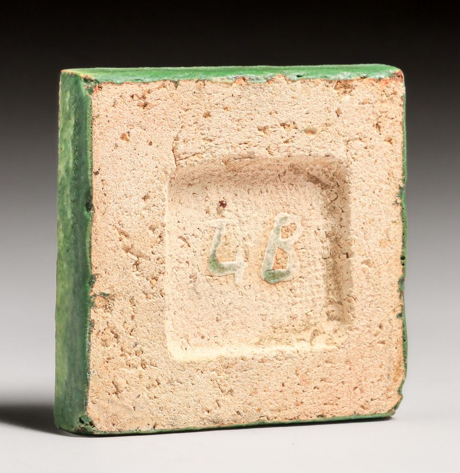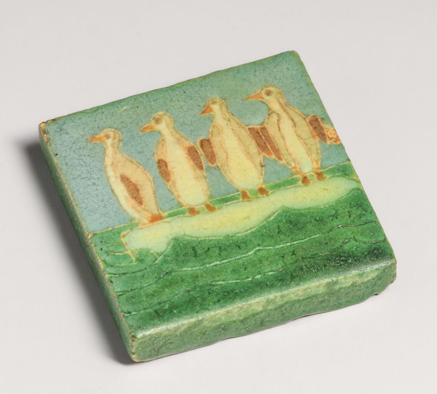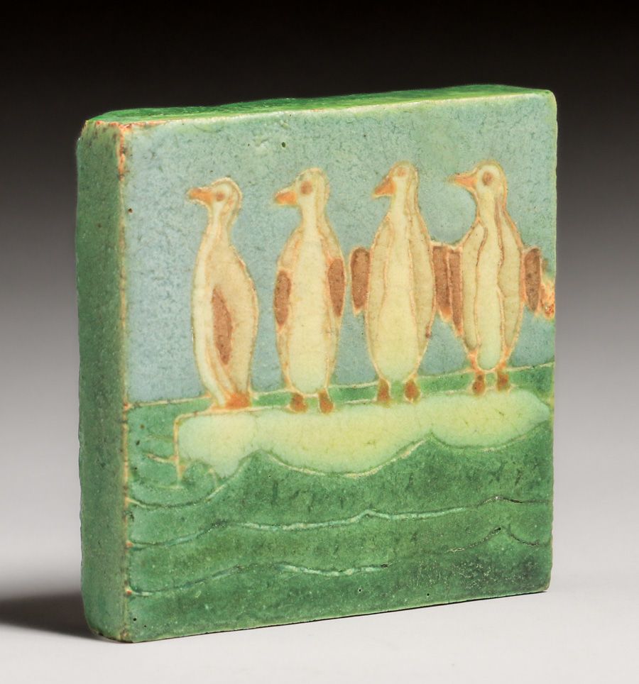 Grueby Faience Rare Penguin Tile c1905. Very crisp, well defined example of this rare Grueby tile. Signed only with artist initials "GB". Invisible professional restoration to two small corner chips, otherwise perfect condition. 4" x 4"