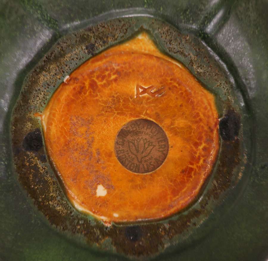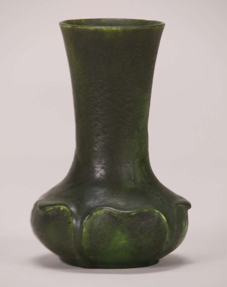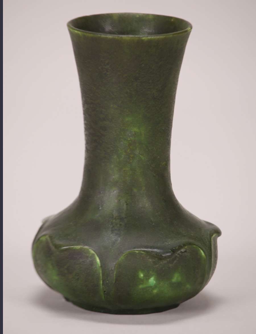 Grueby Matte Green Vase with four leaves at bottom. Signed with rare original paper label. 7″h x 4.5"d SOLD