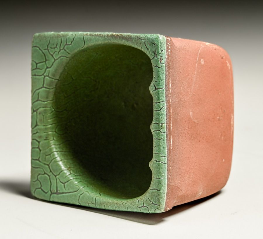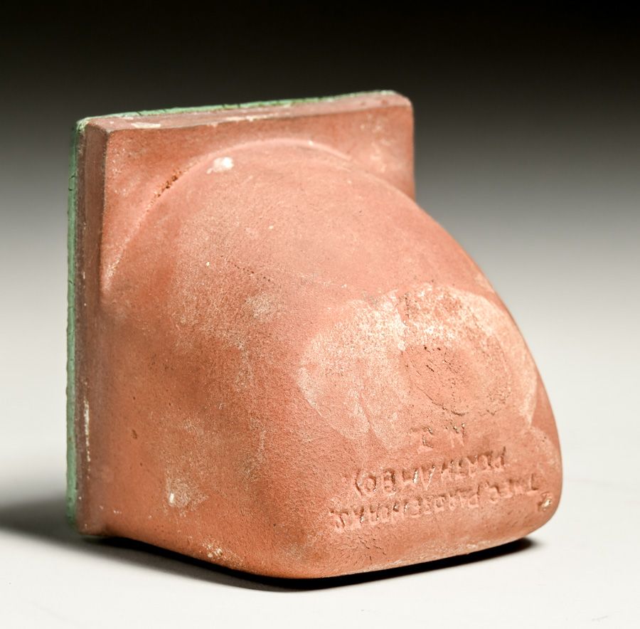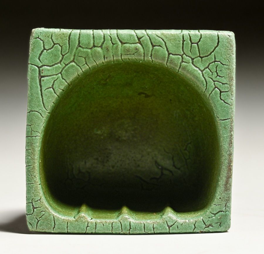 Grueby – Pardee Matte Green Soap Tile after 1919. In 1919, The Pardee Tile Works of Perth Amboy, NJ purchased Grueby molds, forms and glazes. Signed “The C. Pardee Works Perth Amboy, NJ” . Perfect condition. 4.25" x 4.25" x 3.25" depth SOLD