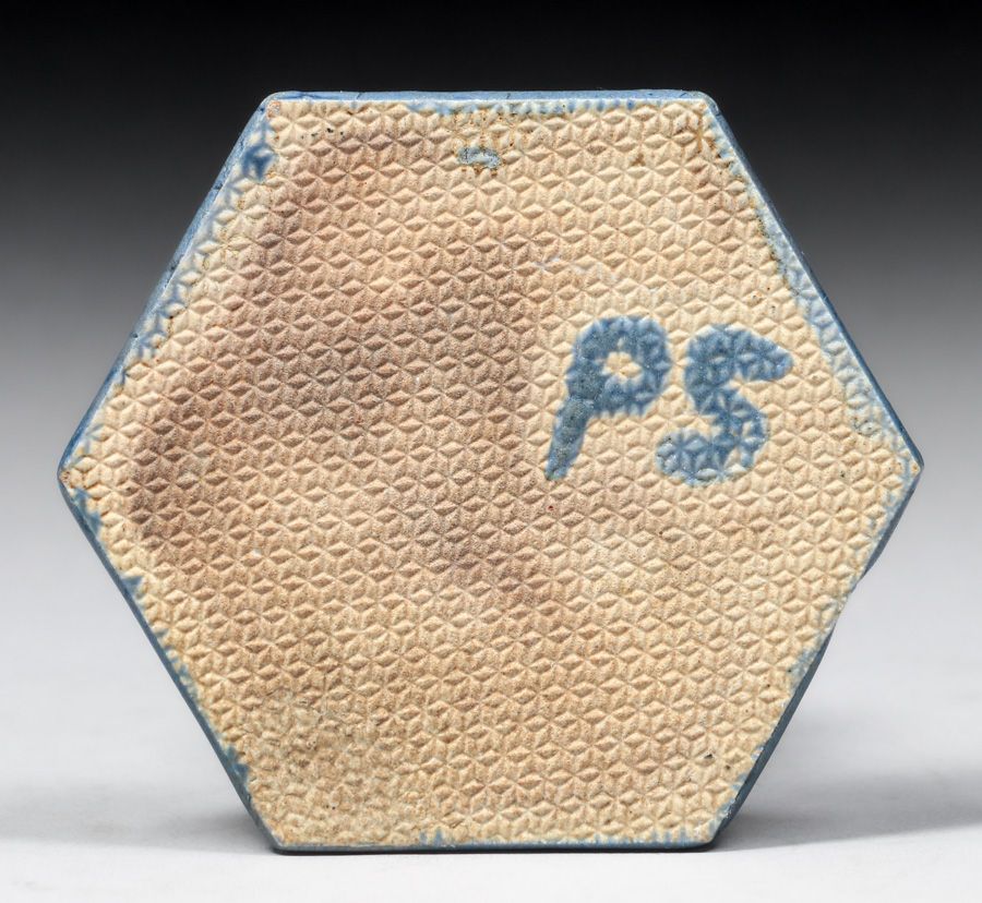 Grueby - Pardee Tile Works Alice in Wonderland Frog-Footman Tile c1917-1920. Signed with artist's initials. Invisible professional restoration to small back edge chip, otherwise perfect condition. 3.75"d SOLD
