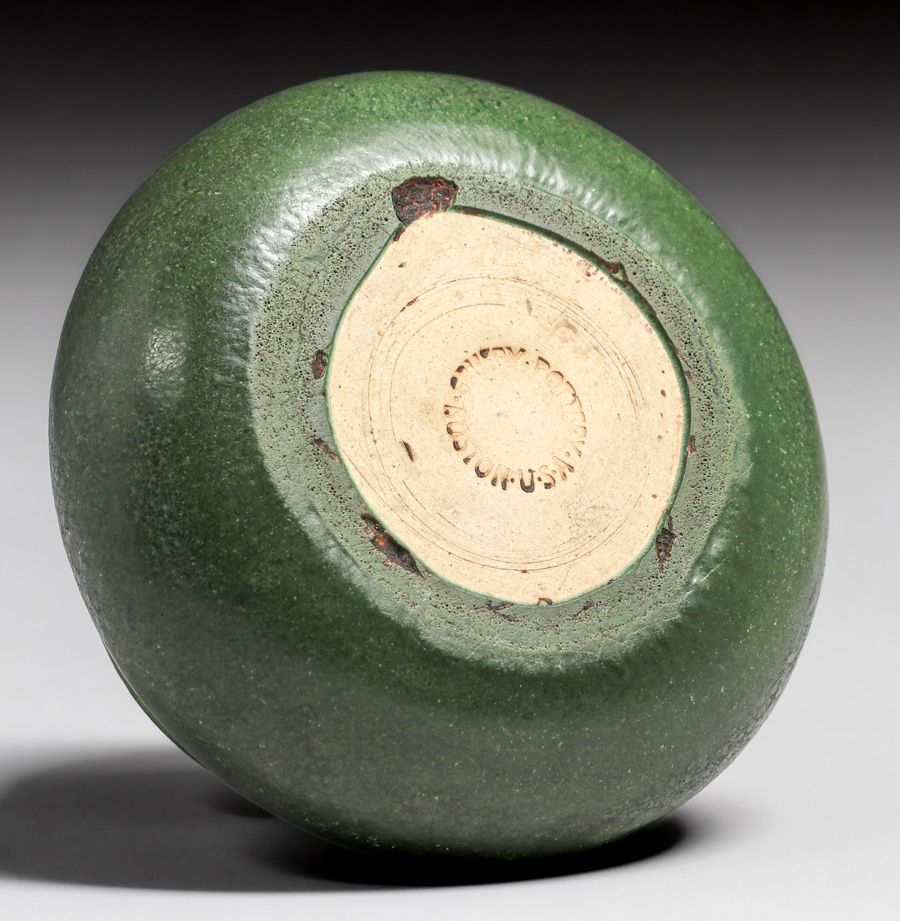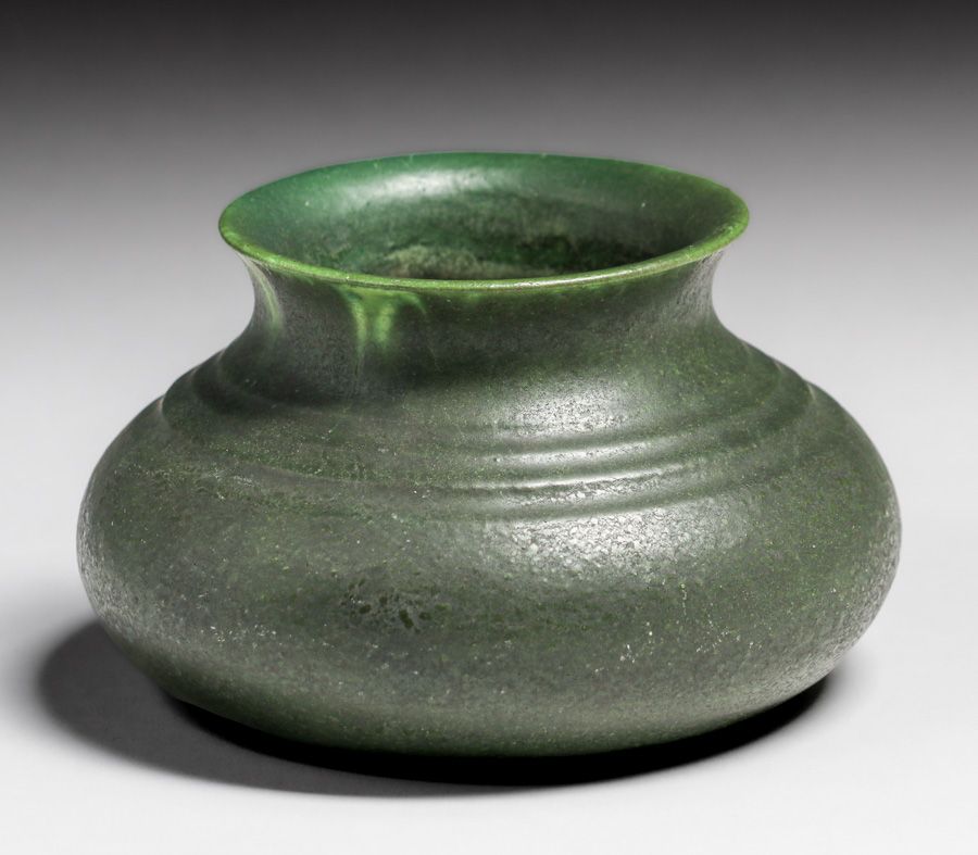 Grueby Pottery Dark Matte Green Vase c1910. Signed. Invisible professional restoration to small rim chip, otherwise perfect condition. 5.25"d x 3"h SOLD