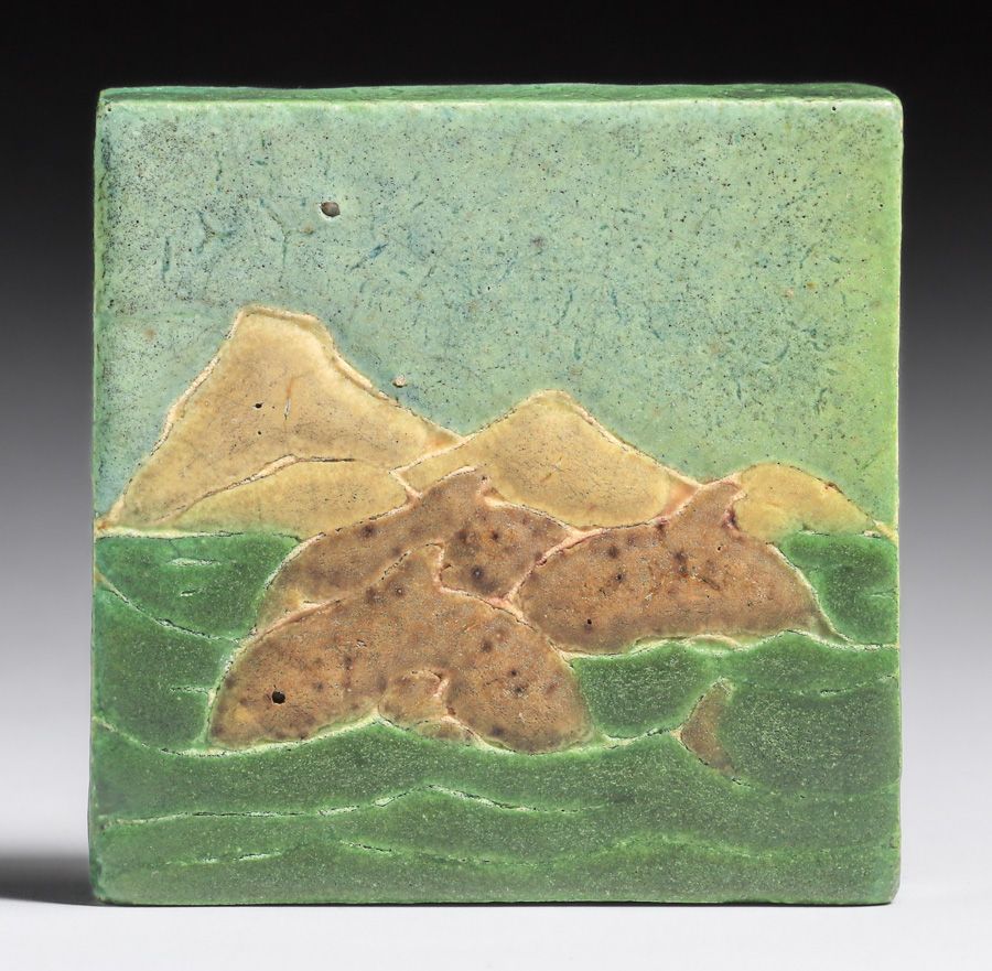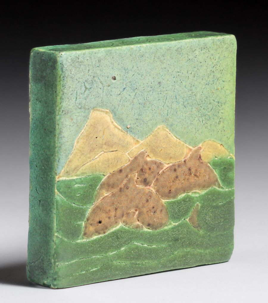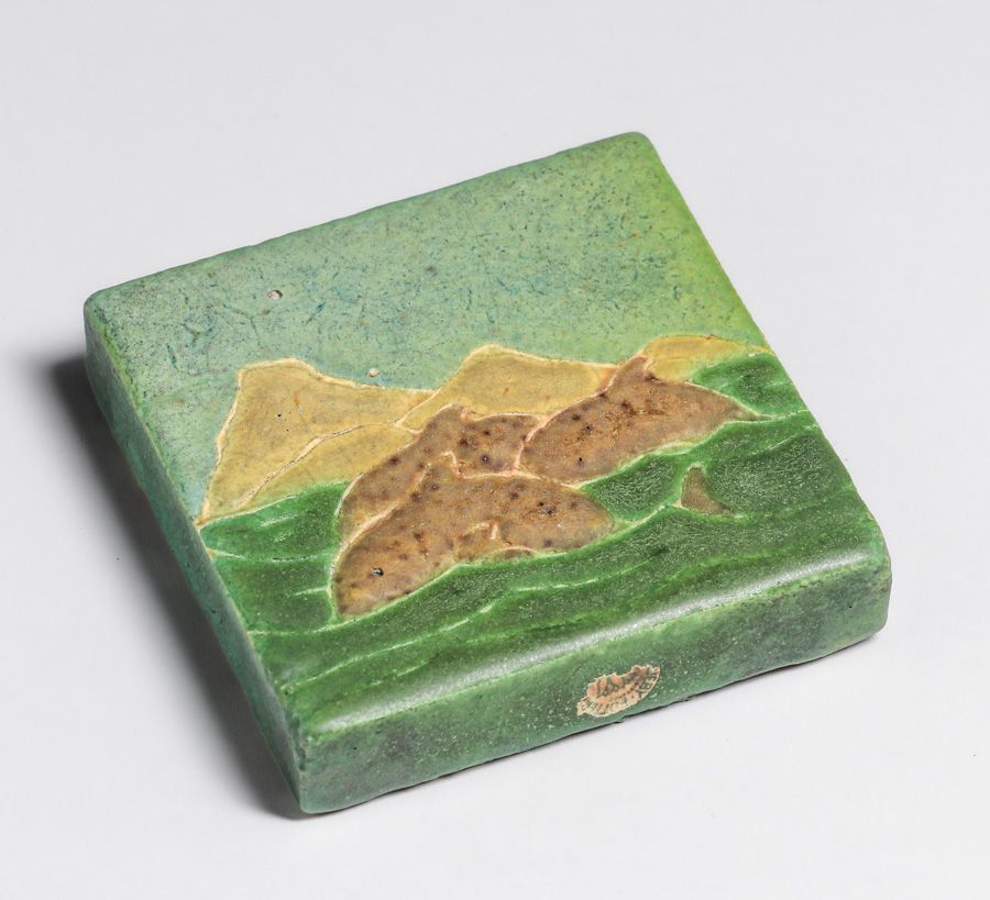 Grueby Pottery Dolphin Tile c1905. Signed. Perfect condition. 4” x 4” SOLD