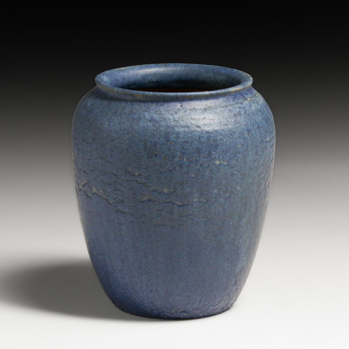 Grueby Pottery Matte Blue Vase c1910. Signed. Invisible professional restoration to small rim chip, otherwise perfect condition. 5 1/8"h x 4.25"d