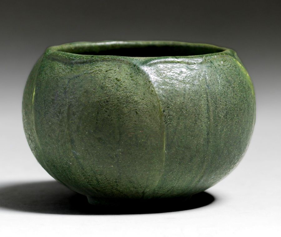 - Grueby Pottery Matte Green Bowl Overlapping Leaves c1905