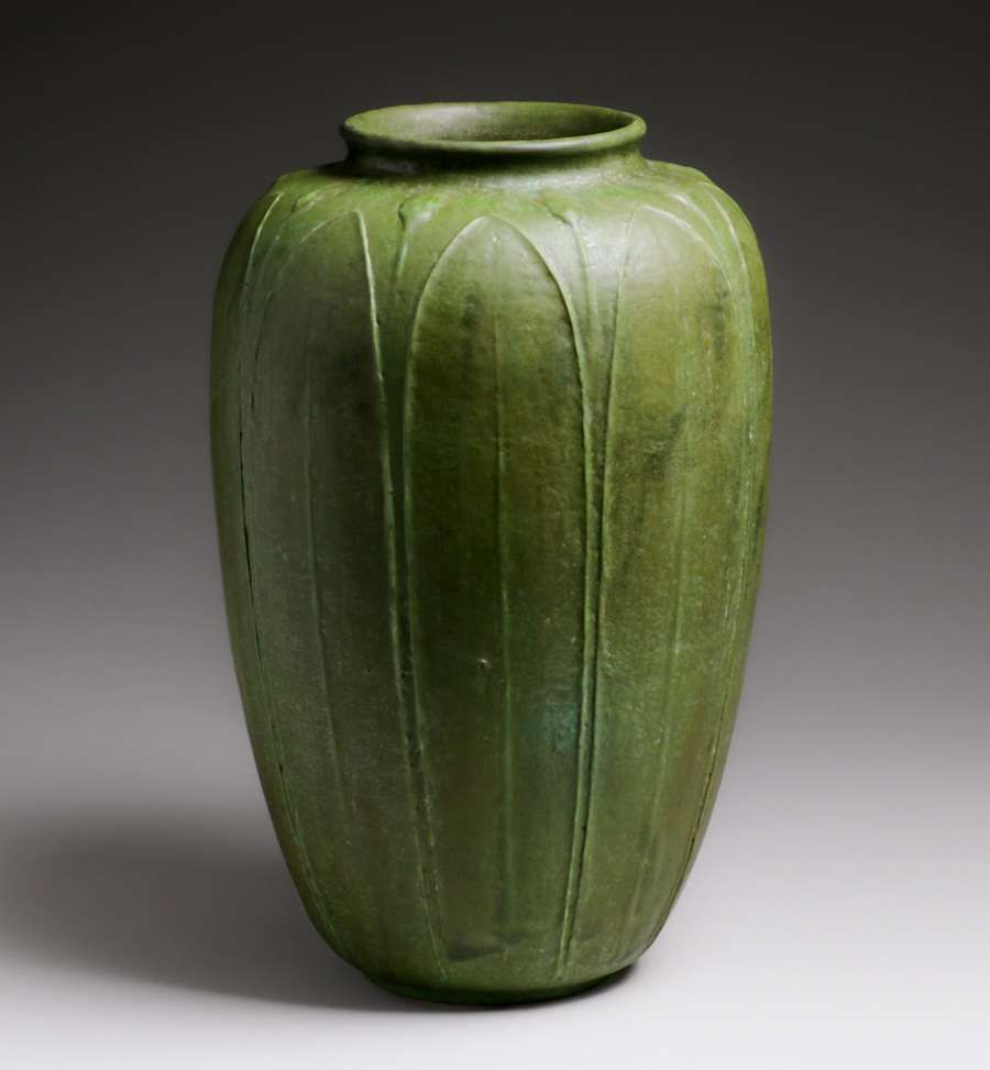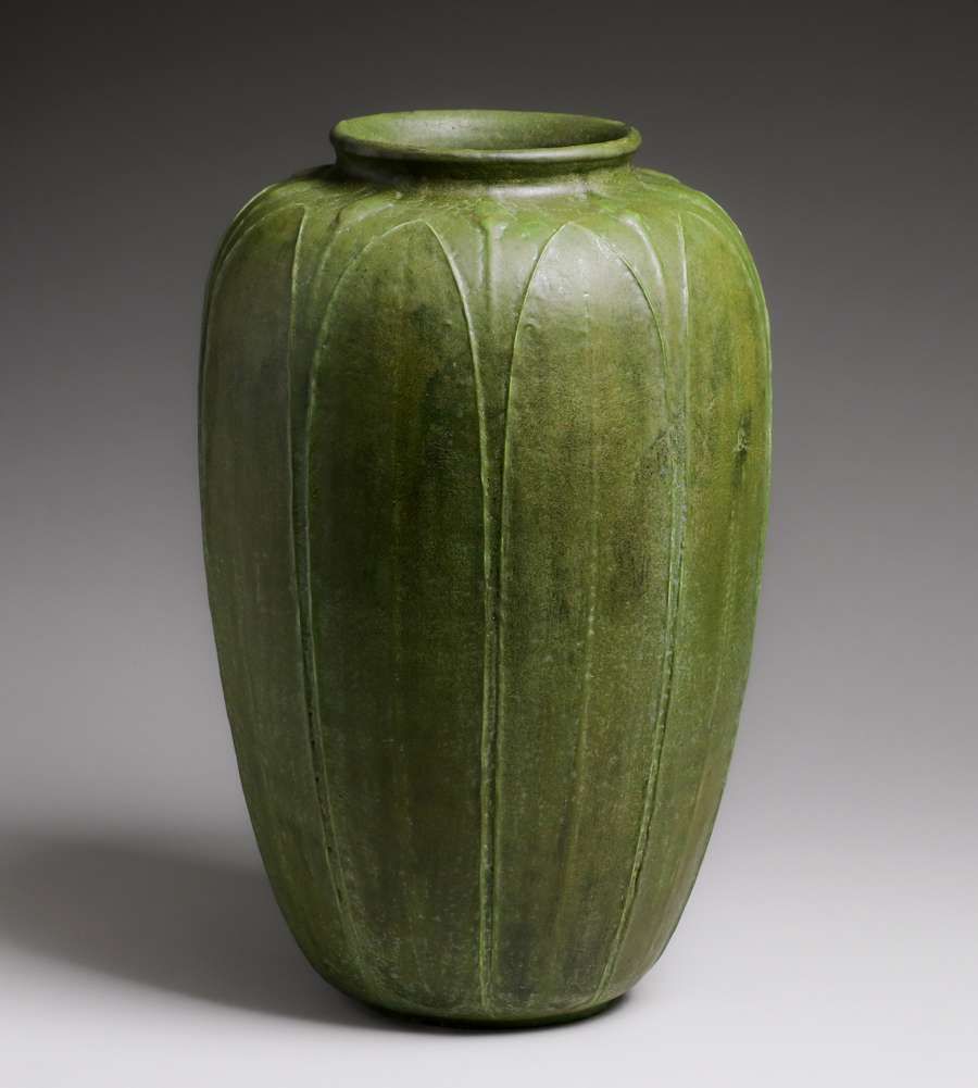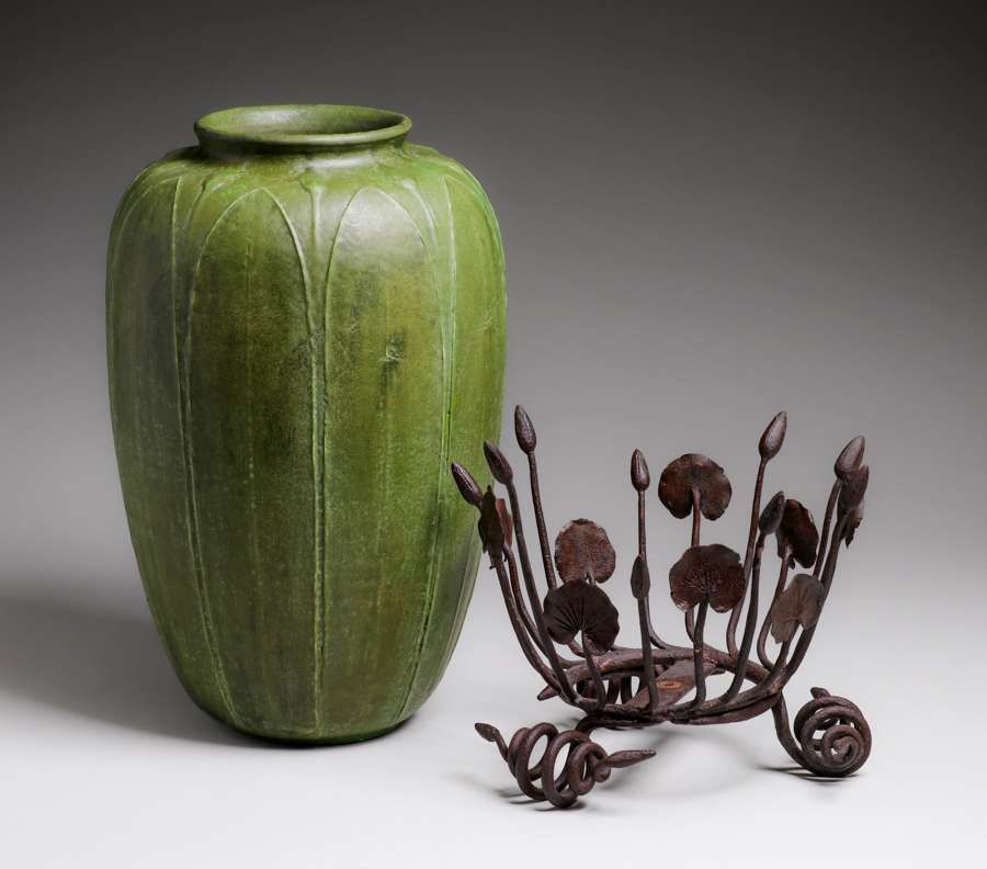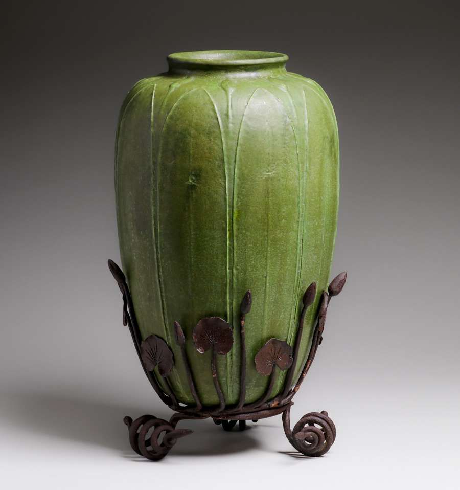 Grueby Pottery Matte Green Vase c1905. Period hand-forged iron stand. Unsigned. Invisible professional restoration to drill hole otherwise perfect condition. Grueby vase 16"h x 9"d. 18.5"h overall SOLD