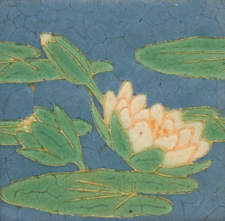 Grueby Pottery Waterlily Tile c1910. Signed. Perfect condition. Tim Holton custom oak frame. Tile 6" x 6". Frame 9.75" x 9.75" SOLD