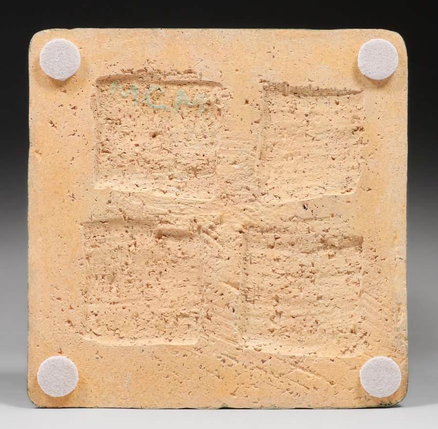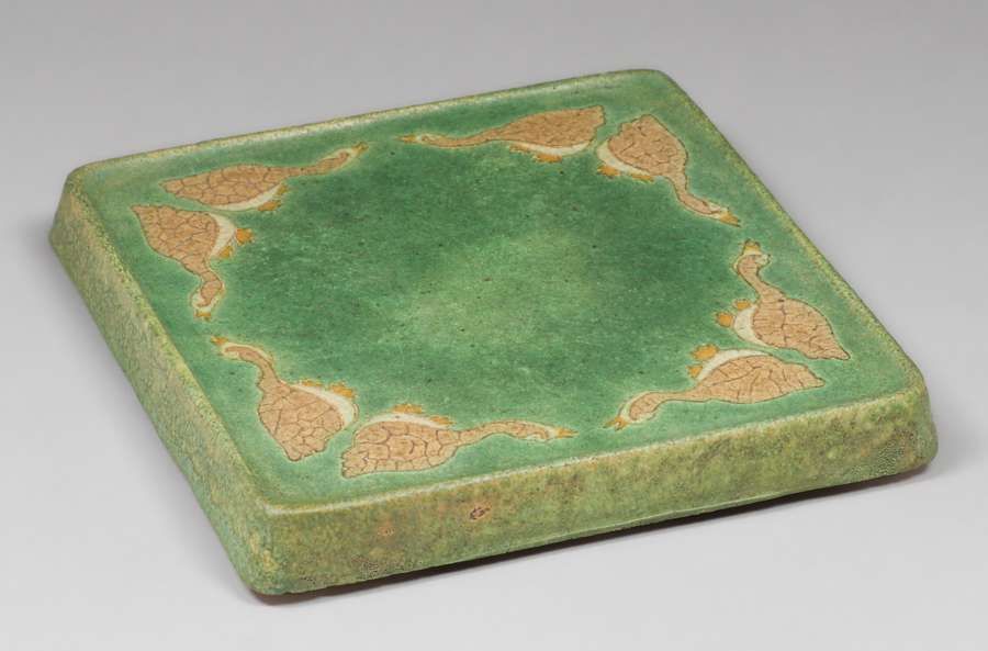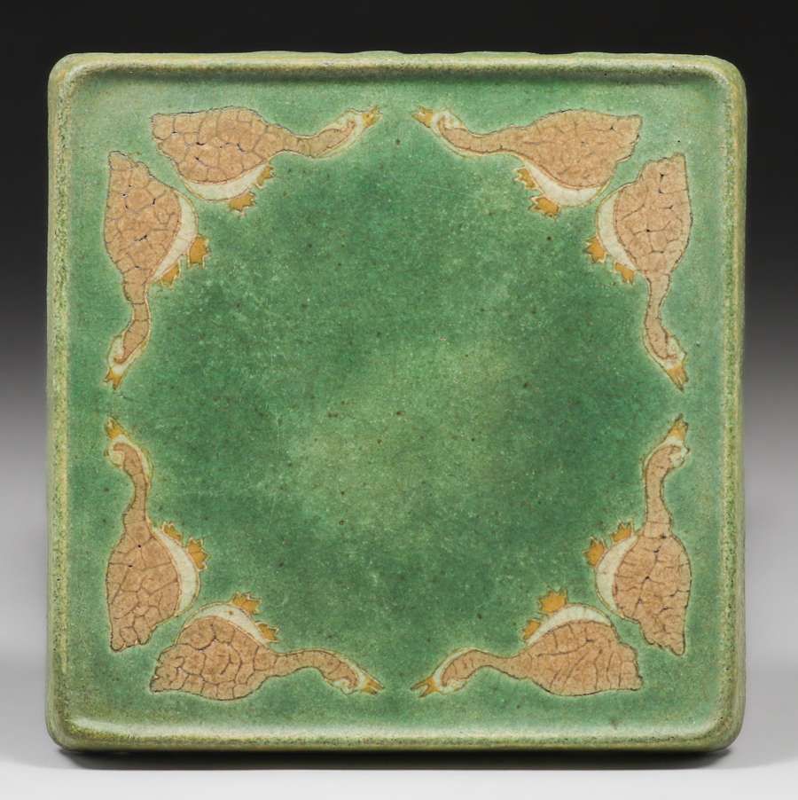 Large Grueby Goose Trivet Tile c1905. Exquisite example of Grueby's "cloisonne" decoration with fine detail and perfectly controlled colors. Artist signed "MCM", otherwise unsigned. Invisible professional restoration to two small base chips and one to the raised edge, otherwise perfect condition. 9.5" x 9.5" x 1 1/8"h SOLD