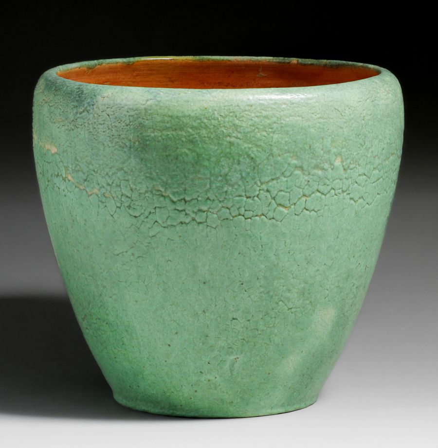 Large Grueby Pottery Matte Green Jardiniere c1910. Excellent curdled matte green glaze. Signed. Invisible professional restoration to two small rim chips, otherwise perfect condition. 10"h x 11"d SOLD