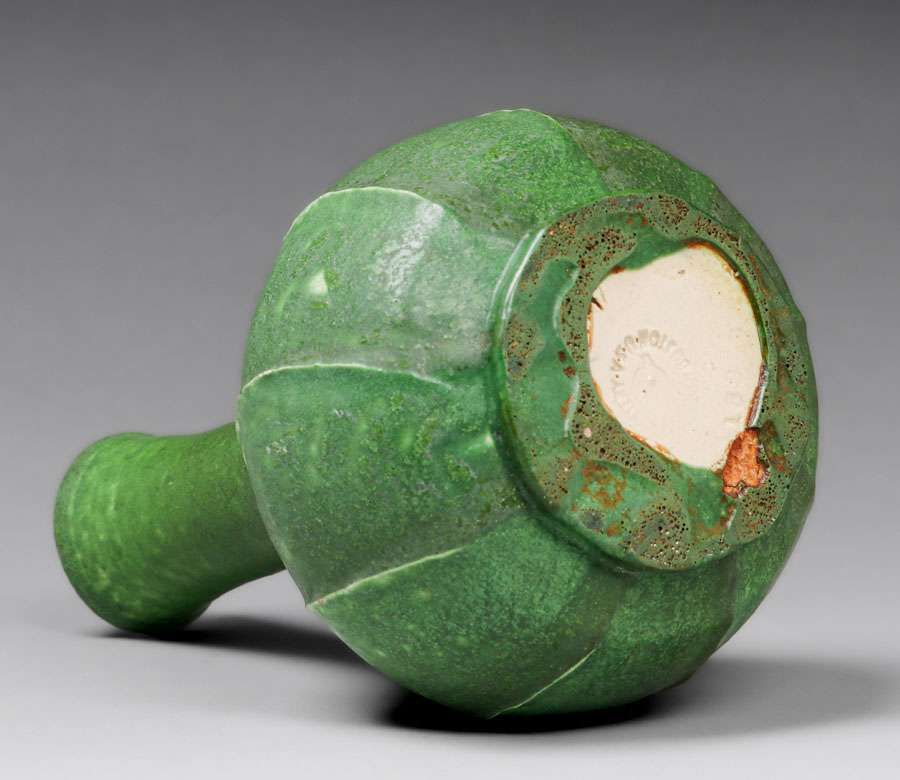 Unusual Grueby Pottery Matte Green Overlapping Leaf Vase c1905. Signed. A few tiny flecks to the high points of the leaves, otherwise perfect condition. 9 3/8"h x 5.5"d SOLD