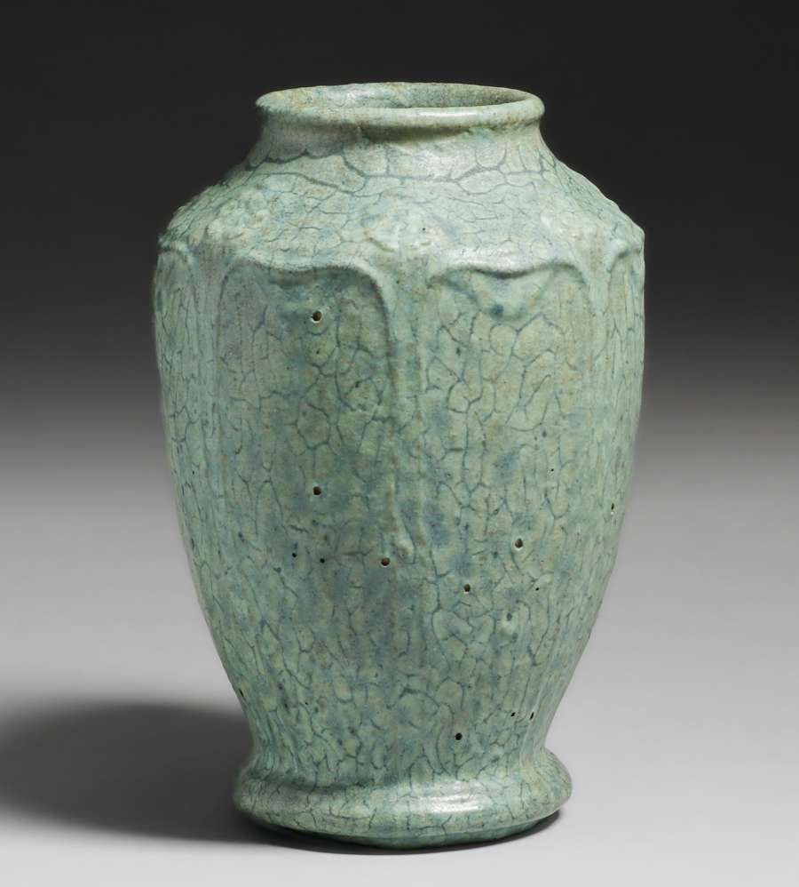 - Unusual Grueby Pottery Ruth Erickson Mottled Matte Blue Green Vase c1905