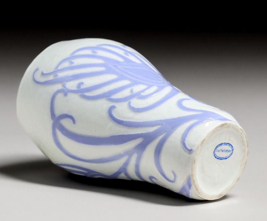 Josef Ekberg - Gustafsberg Swedish Carved Peacock Feather Porcelain Vase 1903. Signed. Perfect condition. 6.25"h x 3.5"d $1500