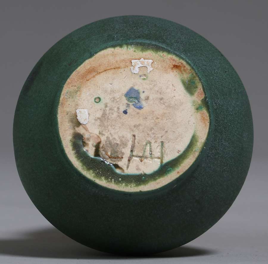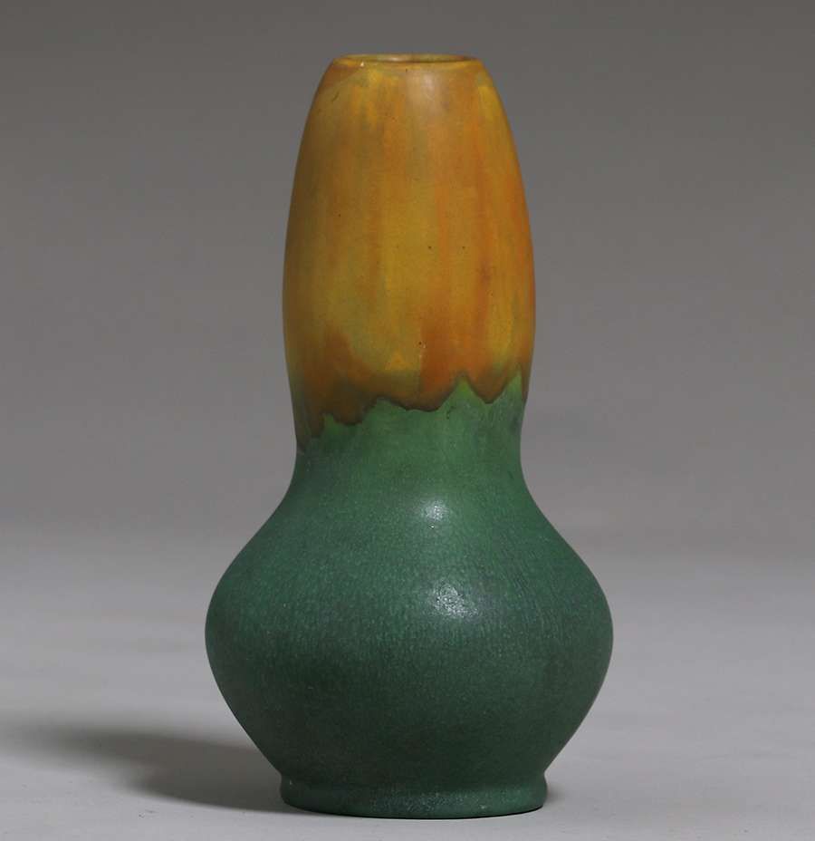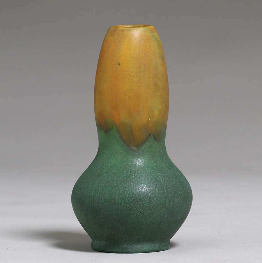 Early Hampshire Pottery vase with a mustard yellow over green matte glaze. Signed. Perfect condition. 8.75"h x 4.5"d SOLD