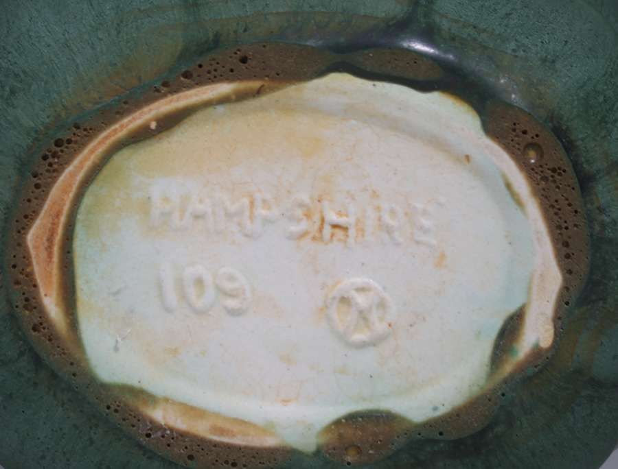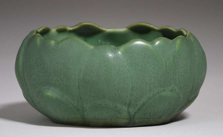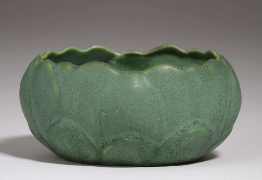 Hampshire Pottery matte green oval-shaped artichoke bowl. Signed. 4.5"w x 3.5"w x 2"h SOLD