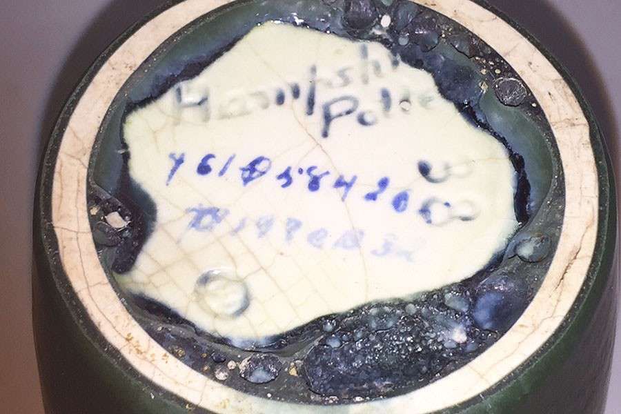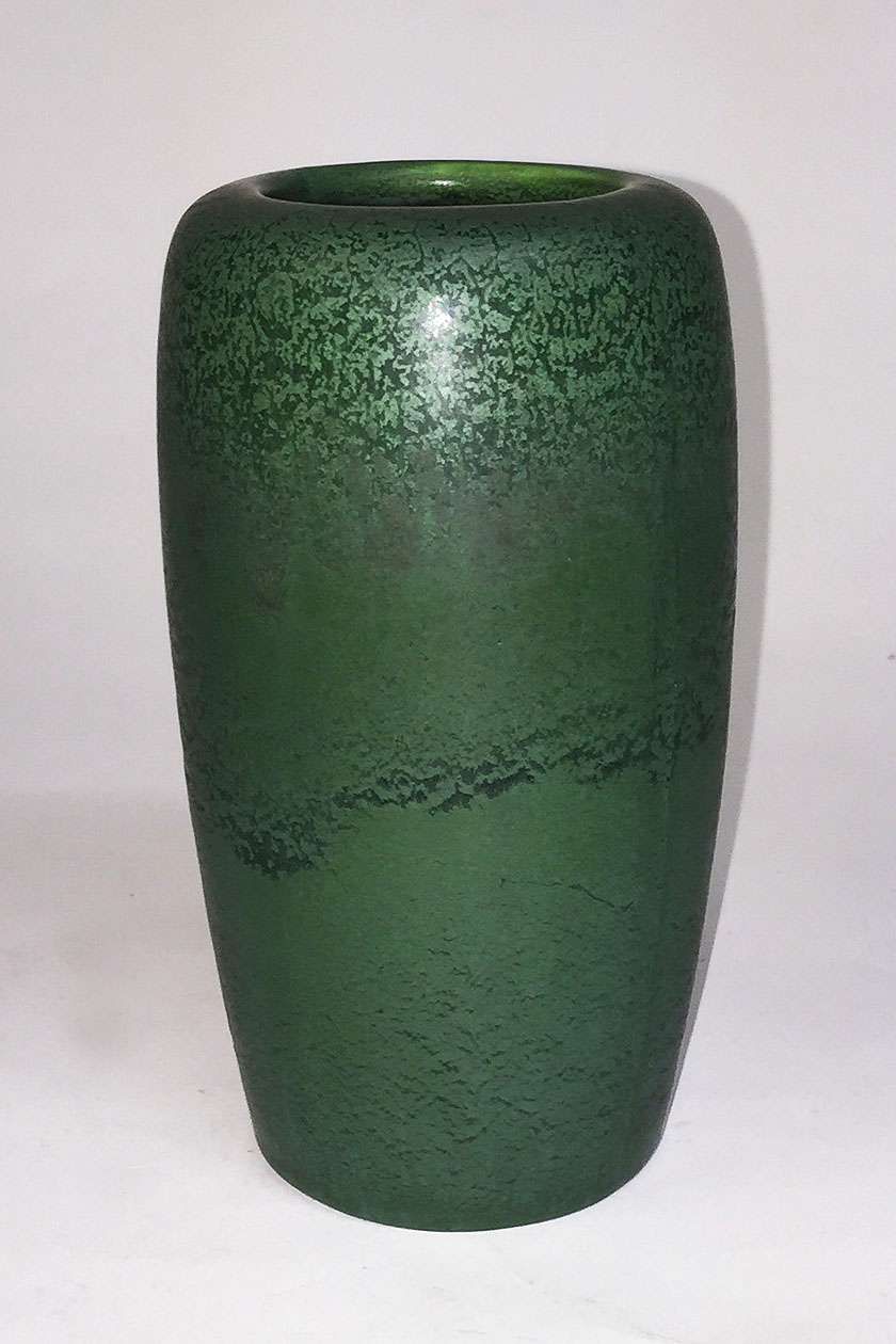 Hampshire Matte Green Cylindrical Vase. Signed. Heavily crazed base, otherwise perfect. 7.25"h SOLD