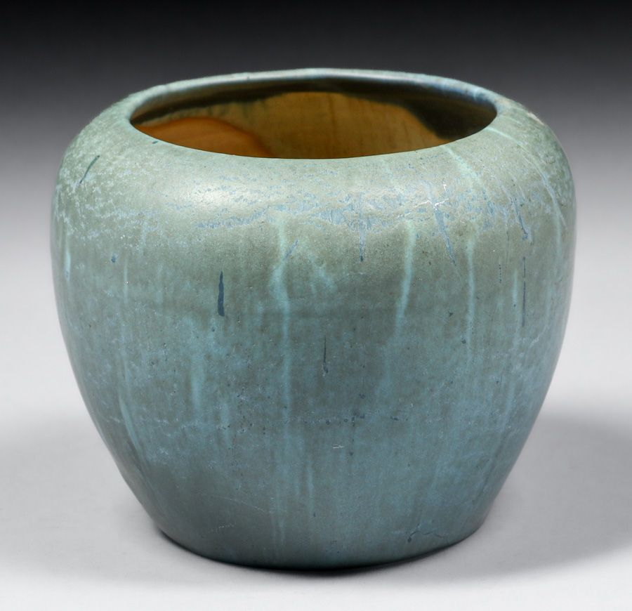 Hampshire Pottery Matte Blue Vase c1910. Signed. Spider lines to base, otherwise perfect condition. 4.5"h x 4.25"d SOLD