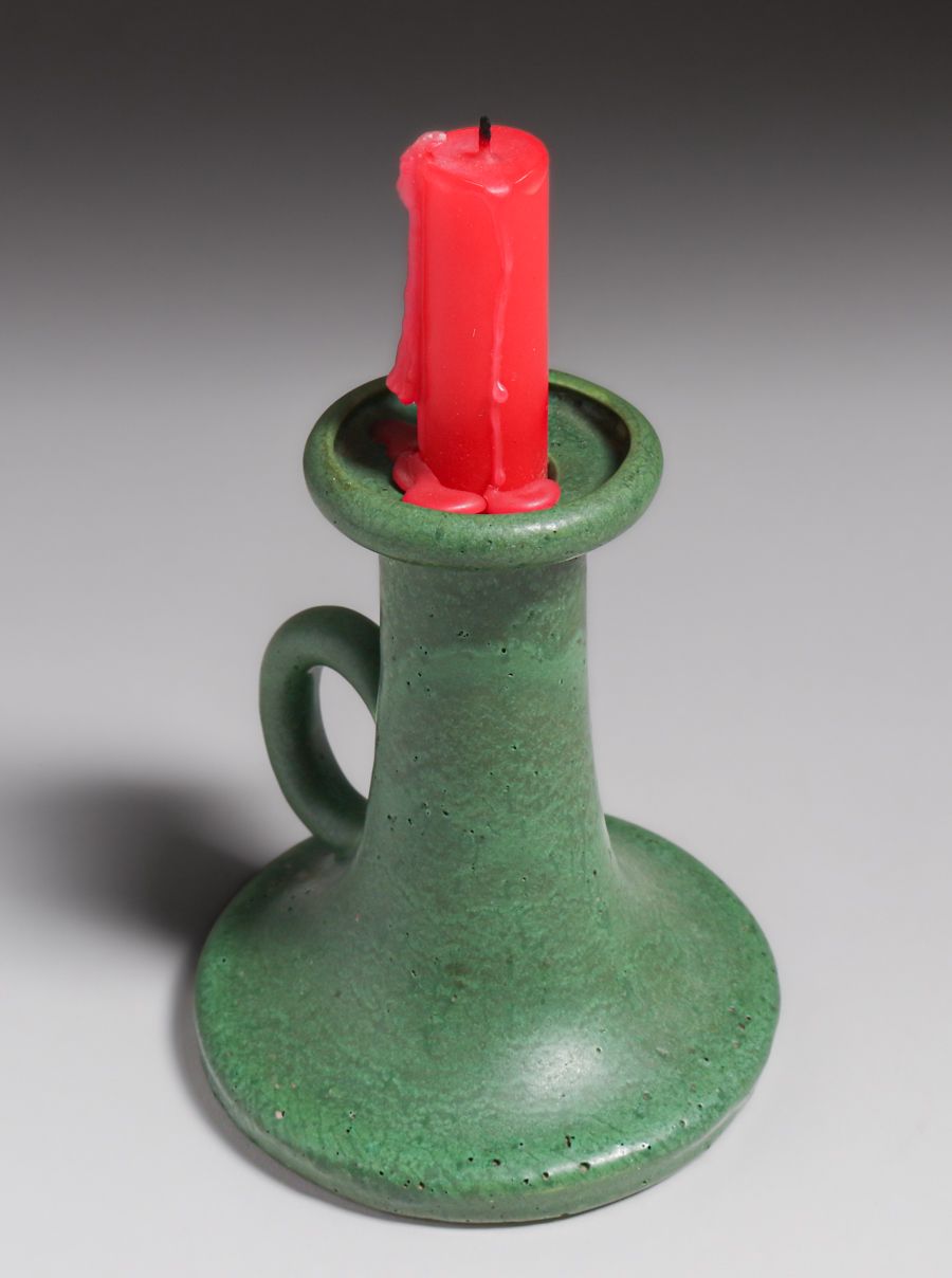 Hampshire Pottery Matte Green Loop Handle Candlestick c1910. Signed. Perfect condition. 5.5"h x 4.5"d SOLD
