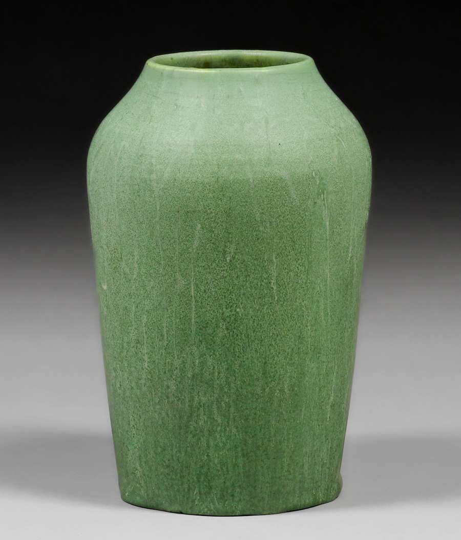 Hampshire Pottery Matte Green Vase c1910. Unsigned. Invisible professional restoration to small base chips, otherwise perfect condition. 6.75"h x 4"d SOLD