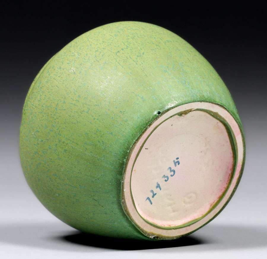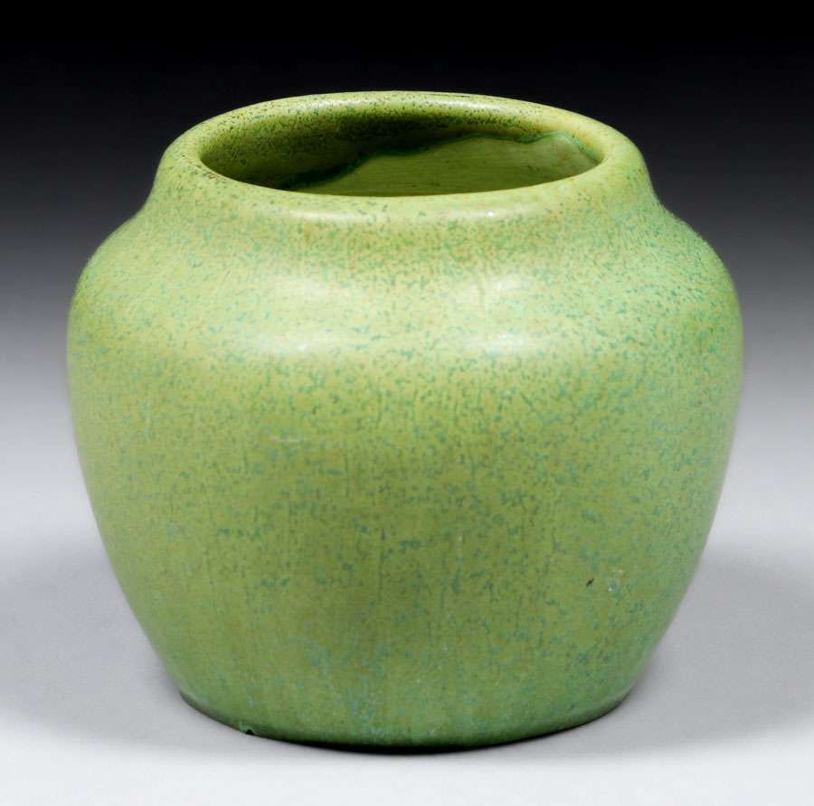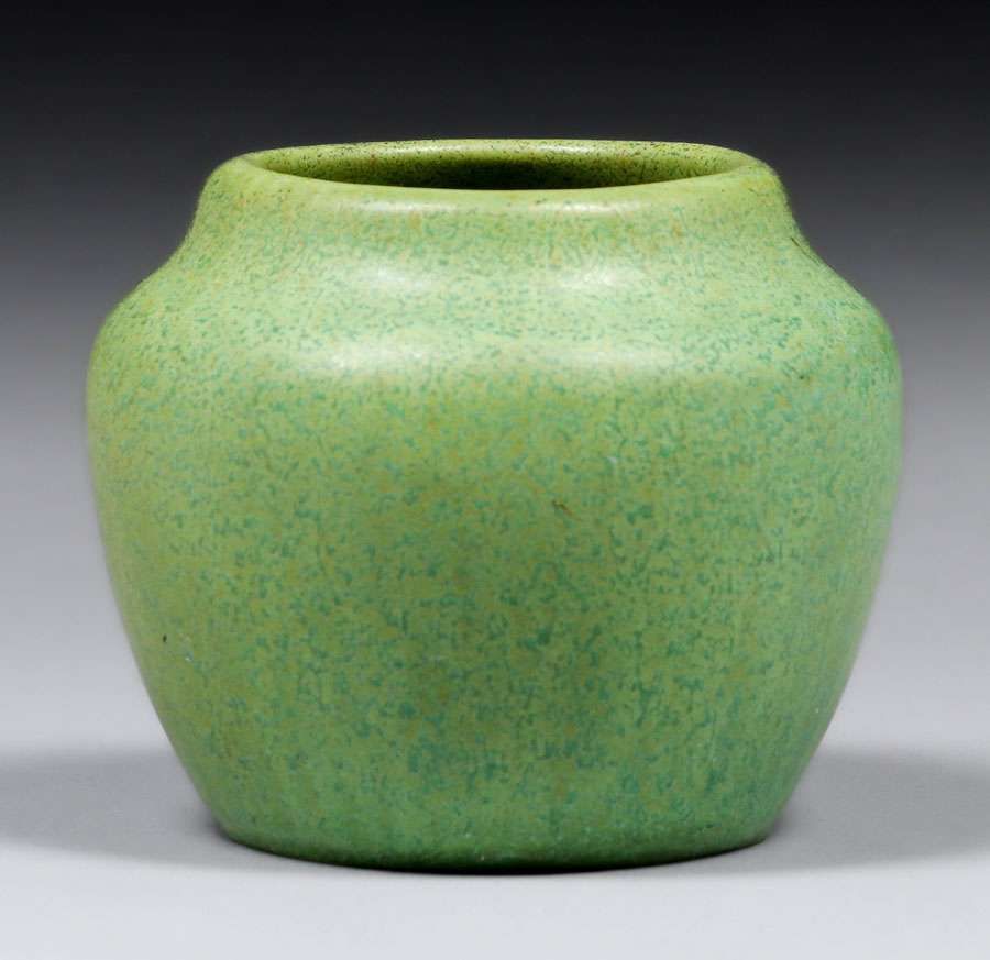 Hampshire Pottery Matte Green Vase c1910. Signed. Perfect condition. 4"d x 3 3/8"h SOLD