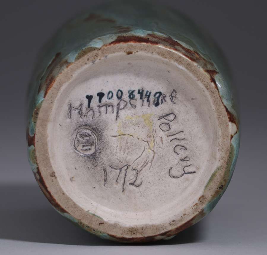 Hampshire Pottery cylinder vase with mottled matte green glaze. Signed. Perfect condition. 5.25"h x 3"d SOLD