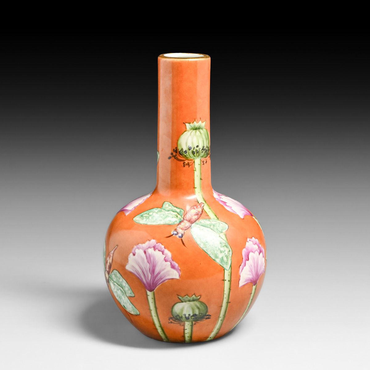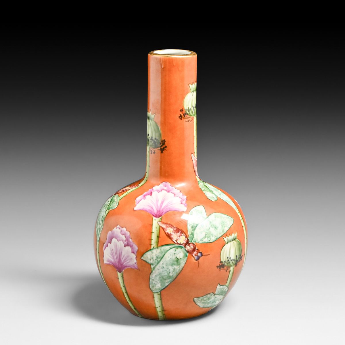 - American Opium Poppy & Dragonfly Hand-Decorated European Porcelain Vase c1910