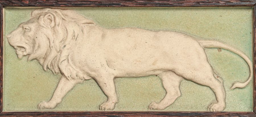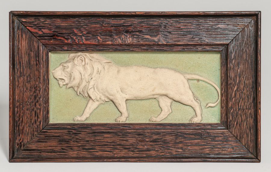 Hartford Faience Lion Tile c1920. Unsigned. Perfect condition. 4"h x 9"w. Oak frame 7.75"h x 12.75"w SOLD