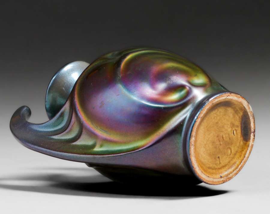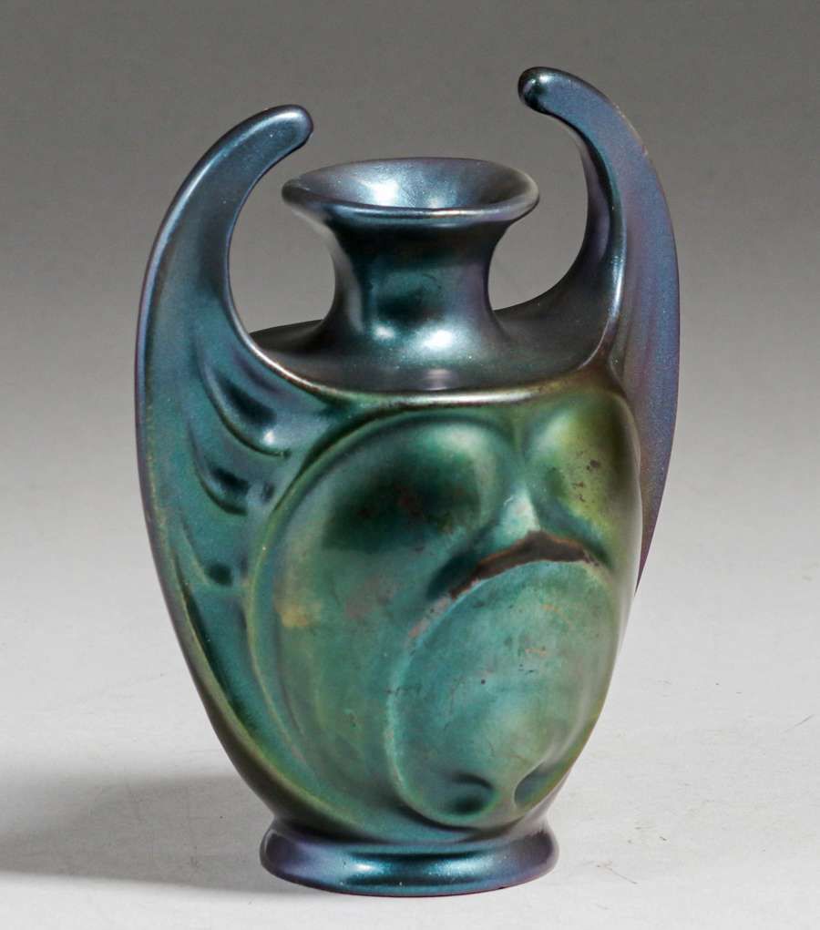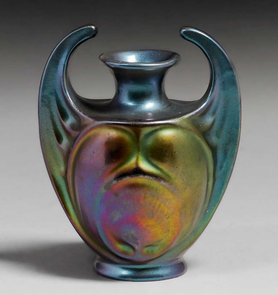 - Heliosine Pottery Two-Handled Iridescent Bat Wing Vase c1905