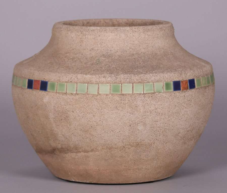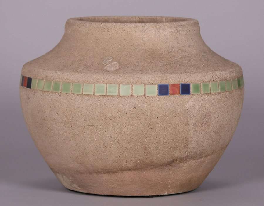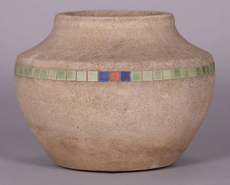 Hillside Pottery cement jardiniere with inset square tiles. Unsigned. Perfect condition. 12"h x 16"d SOLD