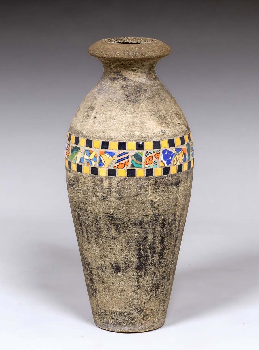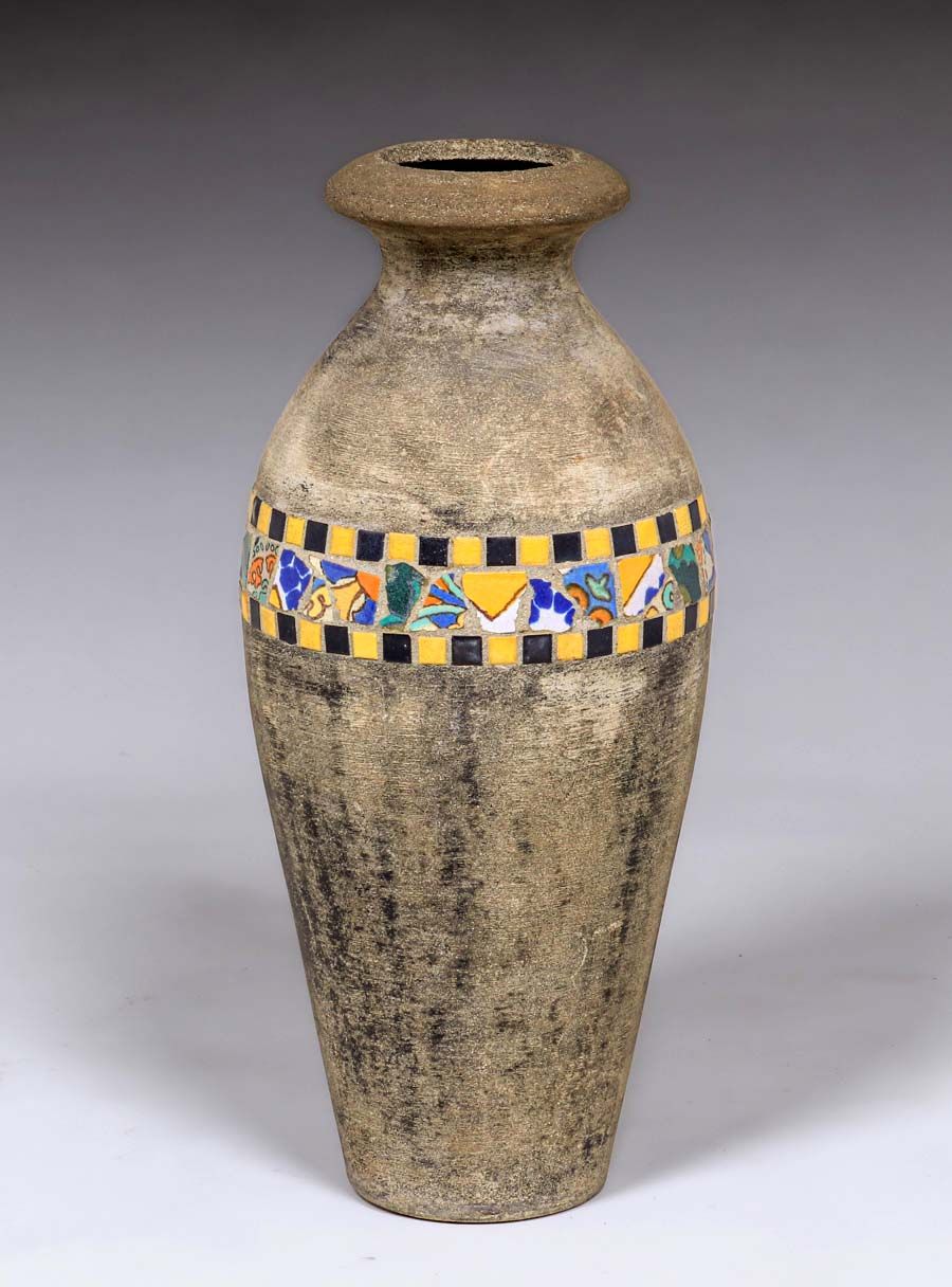 Hillside Pottery Tiled Cement Garden Vase c1920s. Unsigned. Near perfect condition. 29"h x 11"d SOLD