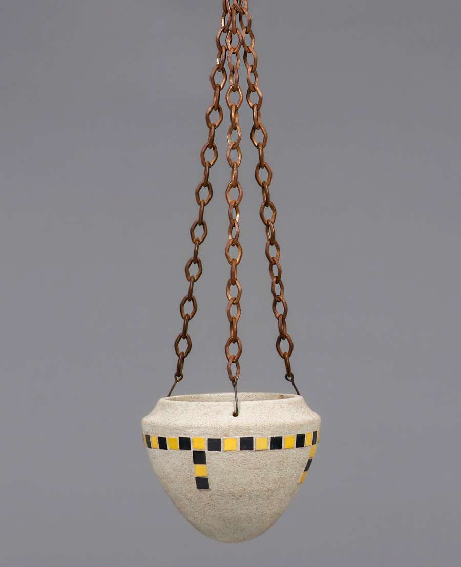 Hillside Pottery Tiled Cement Hanging Planter c1920s. Unsigned. Invisible professional restoration to two tiles, otherwise perfect condition. Planter 11"d x 9"h + 20"h chain SOLD