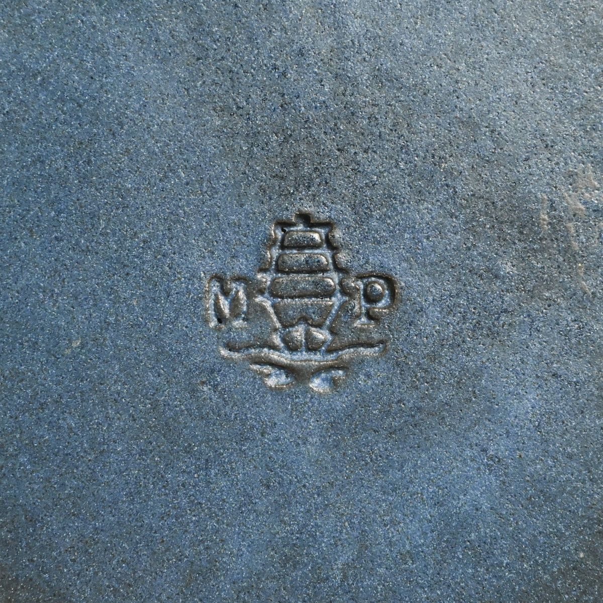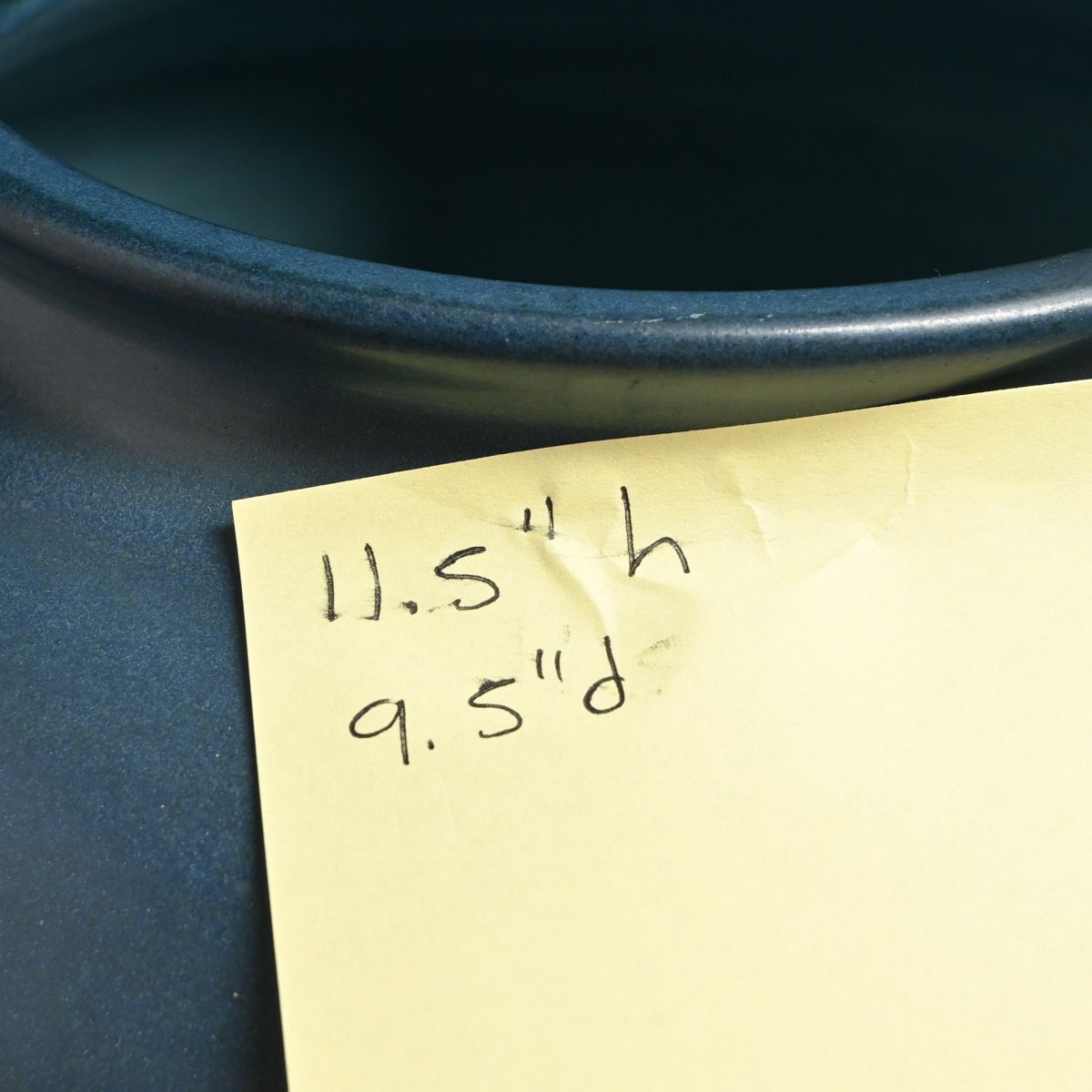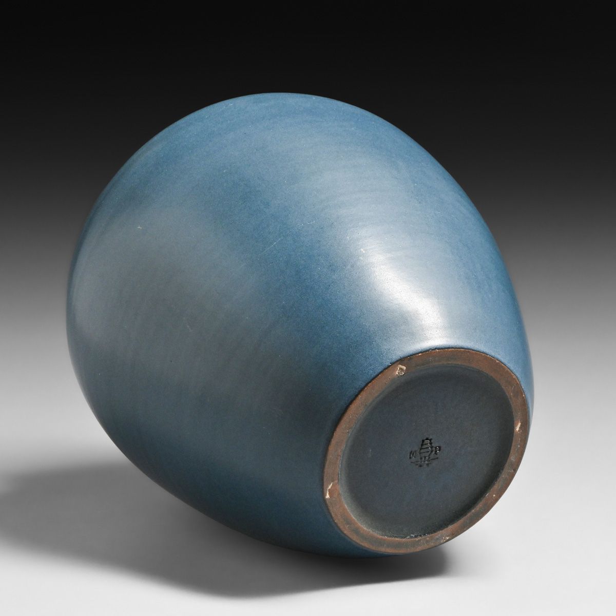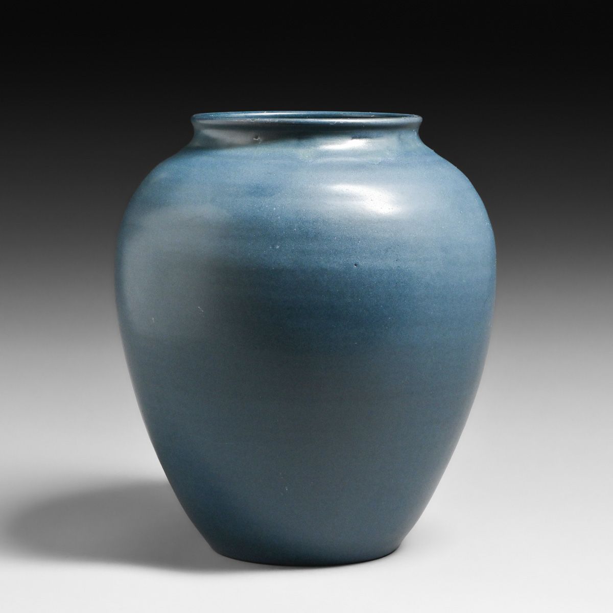 Large Marblehead Pottery Matte Blue Bulbous Vase c1910. Signed. Invisible professional restoration to small rim chip, otherwise perfect condition. 11.5"h x 9.5"d