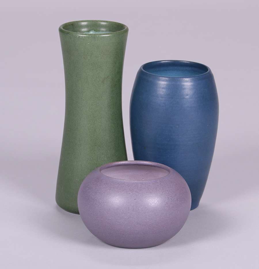Marblehead Pottery : tall matte green 8.5" vase SOLD ; matte blue 6.75" vase SOLD and matte lavender closed 5"d bowl SOLD