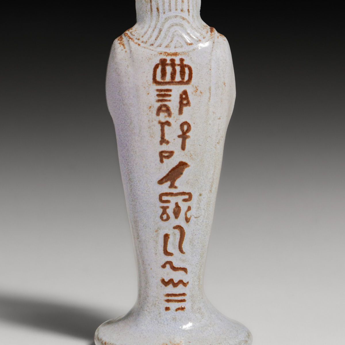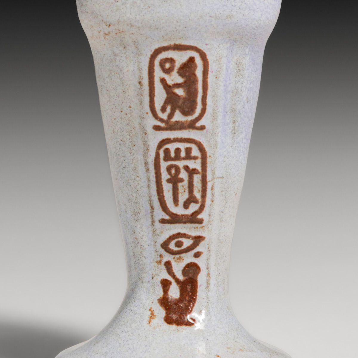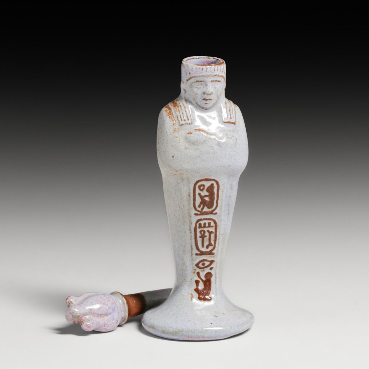 Marblehead Pottery Egyptian Revival Perfume Bottle c1920s. Unsigned. Loss to tip of stopper, otherwise perfect condition. Created in response to the worldwide "Egyptomania" following the 1922 discovery of King Tutankhamun's tomb, these Marblehead Pottery perfume bottles were produced using a mold fashioned from an original ancient Egyptian vessel. The original artifact was sourced from the Metropolitan Museum of Art (The Met) and sent to the pottery's founder, Arthur Baggs, to fulfill a high-demand order for authentic replicas. Architect Arthur Little, a prominent local patron with deep ties to major museums, facilitated this connection to ensure the pottery's Revival works remained historically accurate. 5.25"h x 1.75"d