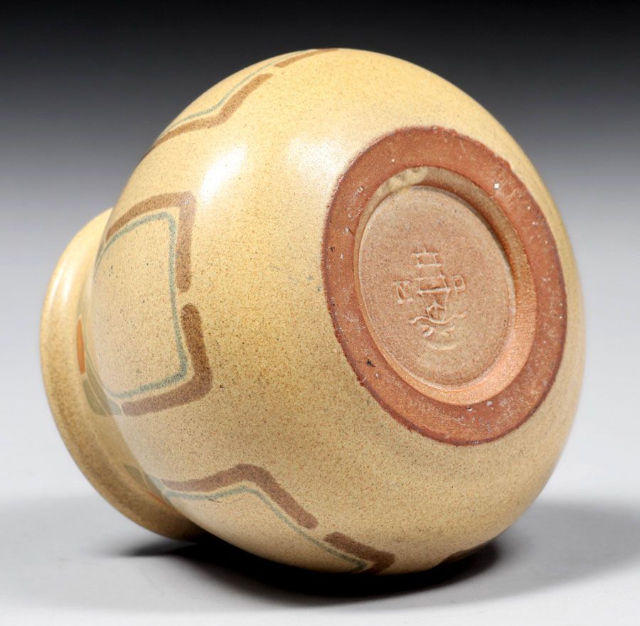 Marblehead Pottery Geometric Floral Decorated Vase c1910. Signed. Invisible professional restoration to tight hairline, otherwise perfect condition. 3 3/8"h x 4"d SOLD