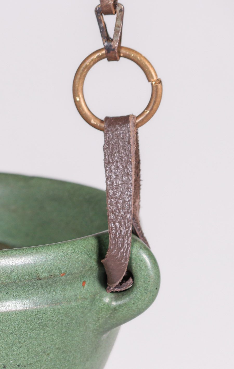 Marblehead Pottery Matte green Hanging Basket c1910. Unsigned. Perfect condition. 5.5"d x 4"h x 19"h overall SOLD