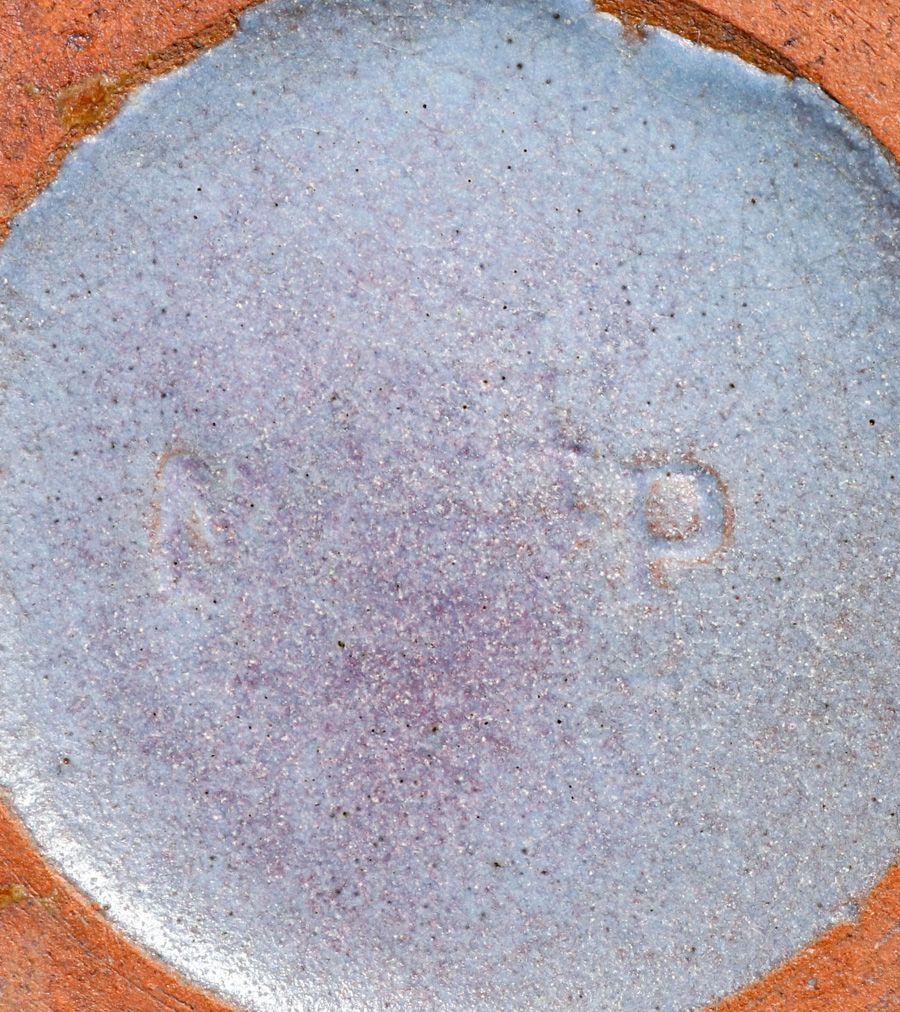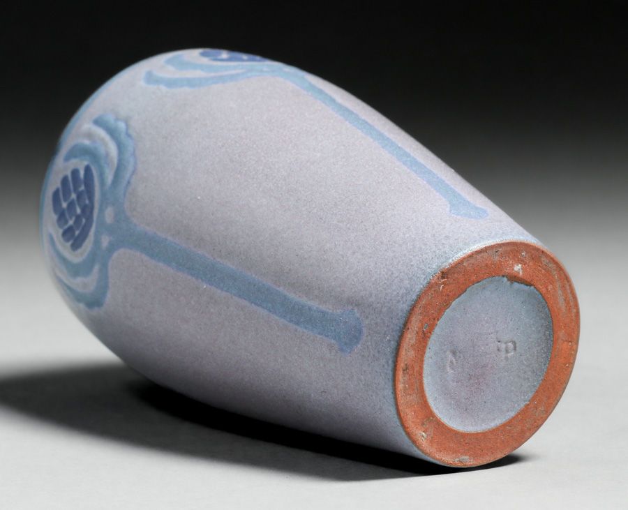 Marblehead Pottery Pinecone Decorated Vase c1910. Signed. Invisible professional restoration to small base chip, otherwise perfect condition. 5.25"h x 3"d SOLD