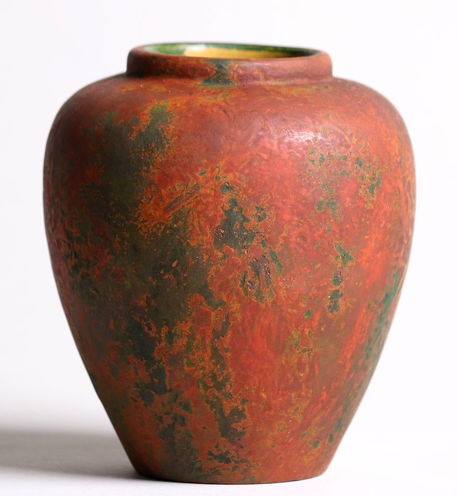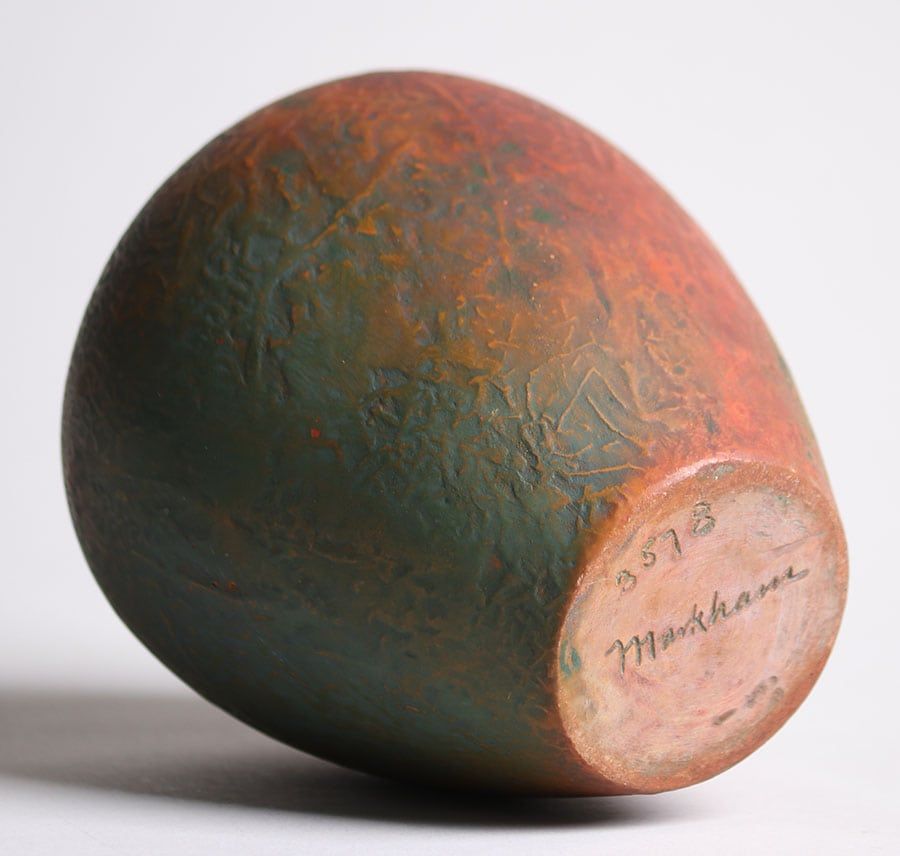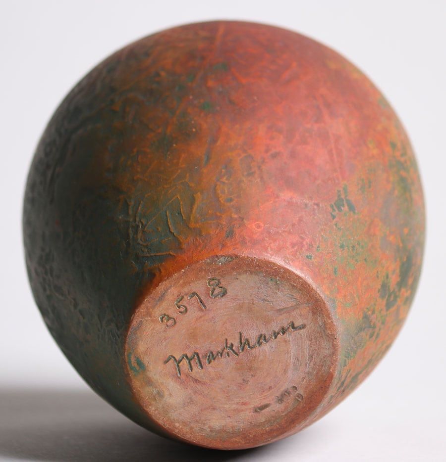 Markham Pottery – (Ann Arbor, MI 1905-1912) Reseau vase #3578. Markham Pottery moved to National City, CA in 1913. All Markham pieces were numbered with pieces above 6000 being attributed to National City. This vase dates to about 1908-1910 and has an exquisite reddish-green tone. Perfect condition 4.25″h x 3.75″d SOLD