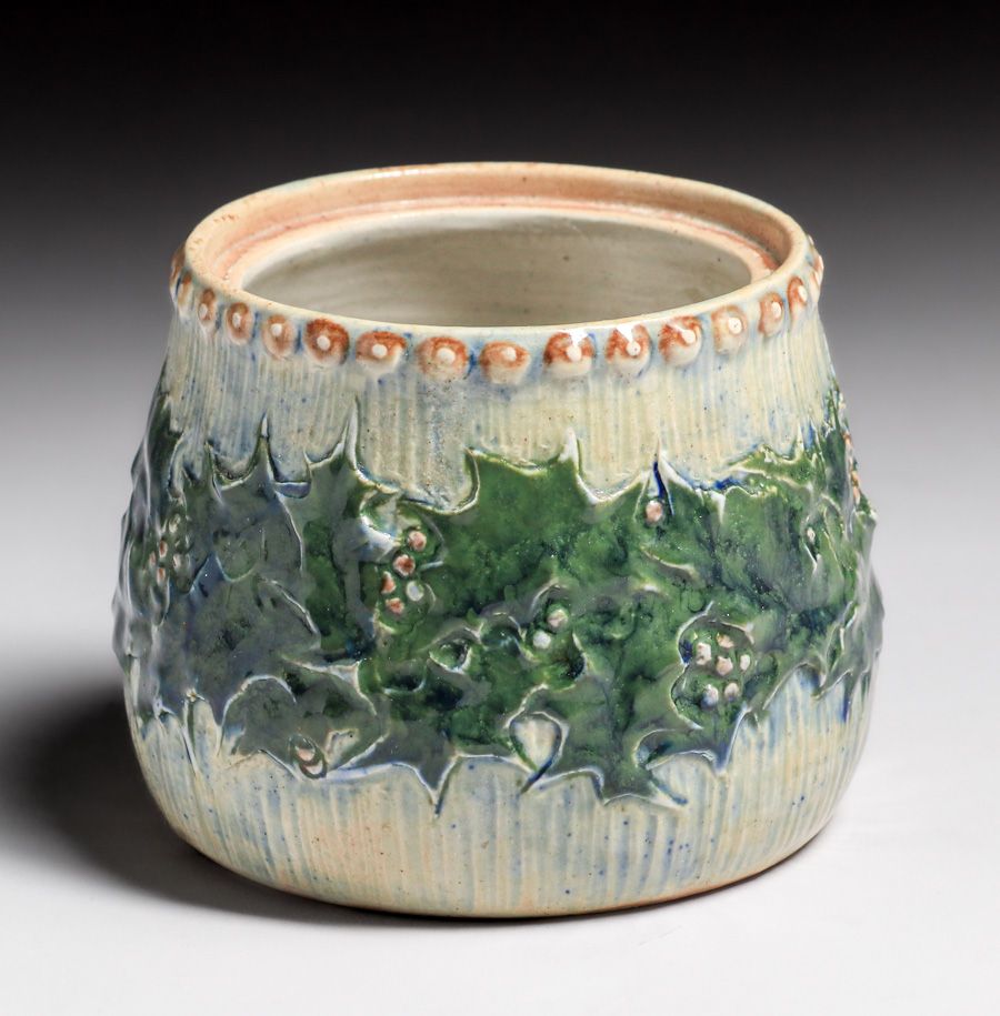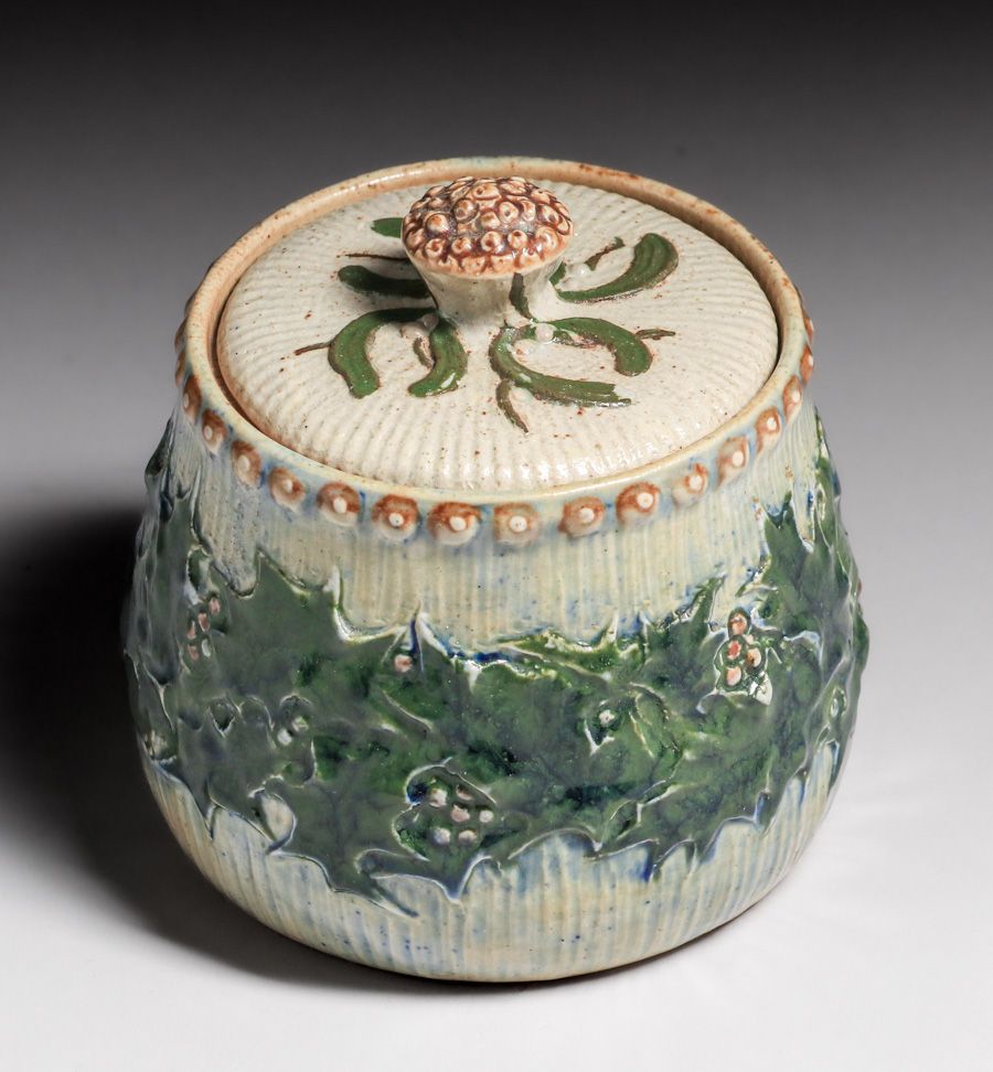 Martin Brothers Oak Leaves & Acorn Finial Covered Vase 1909. Signed. Perfect condition. 4.25”h x 4.25”d SOLD