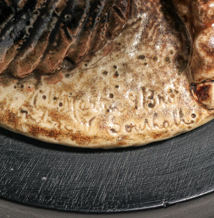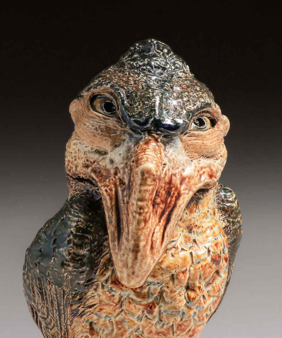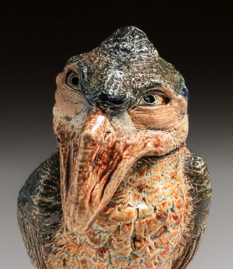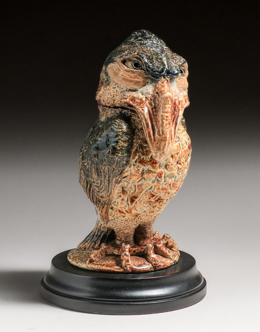 Martin Brothers Wally-Bird Salt-Glazed Tobacco Jar 1887. Signed. Glazed over firing line in tail. Perfect condition. 10 5/8"h × 6.75"w × 7.25"d SOLD
