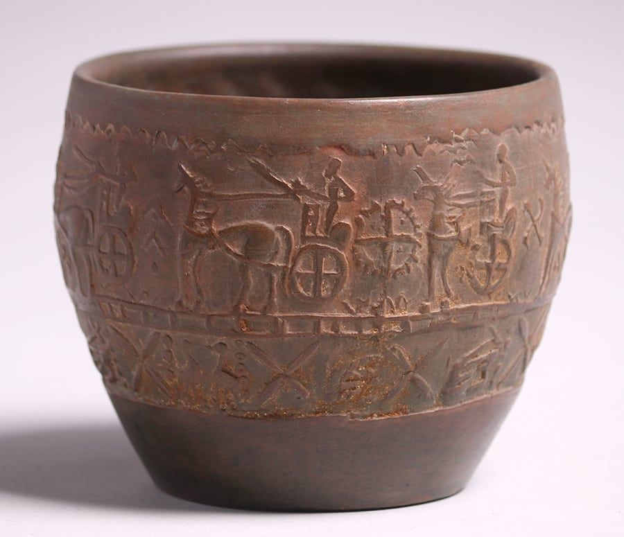 Merrimac Pottery Etruscan vase c1902-1903. Unsigned. Perfect condition. This extremely rare line of Merrimac Pottery was featured in The Craftsman Magazine June 1903, these vases were made from molds of original Roman Etruscan pottery at the Boston Museum of Fine Arts. 4"h x 4.75"d SOLD