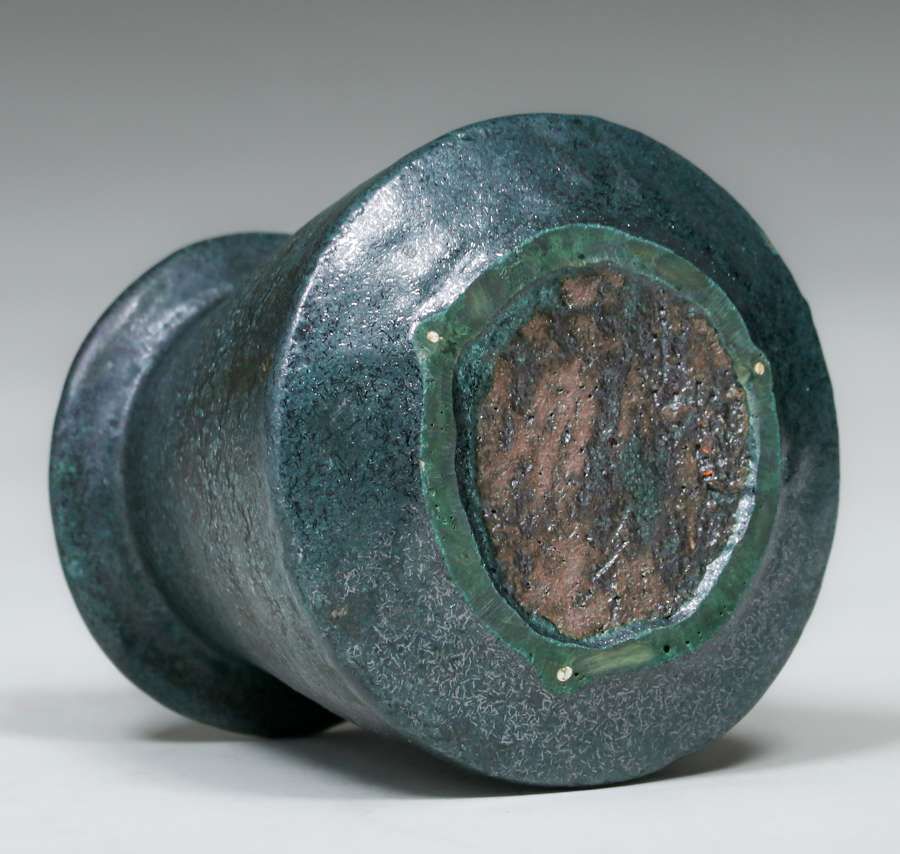 Merrimac Pottery Flared Dark Matte Green Cabinet Vase c1910. Glazed over signature. Invisible professional restoration to small rim chip, otherwise perfect condition. 3"h x 3"d SOLD