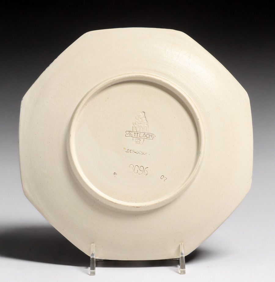 Metlach Pottery – German Arts & Crafts Plate c1910. Signed. Invisible professional restoration to a few small edge chips. 7 3/8″d $375