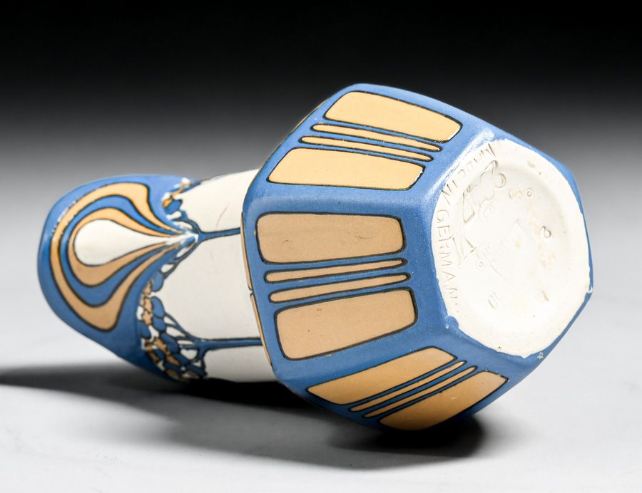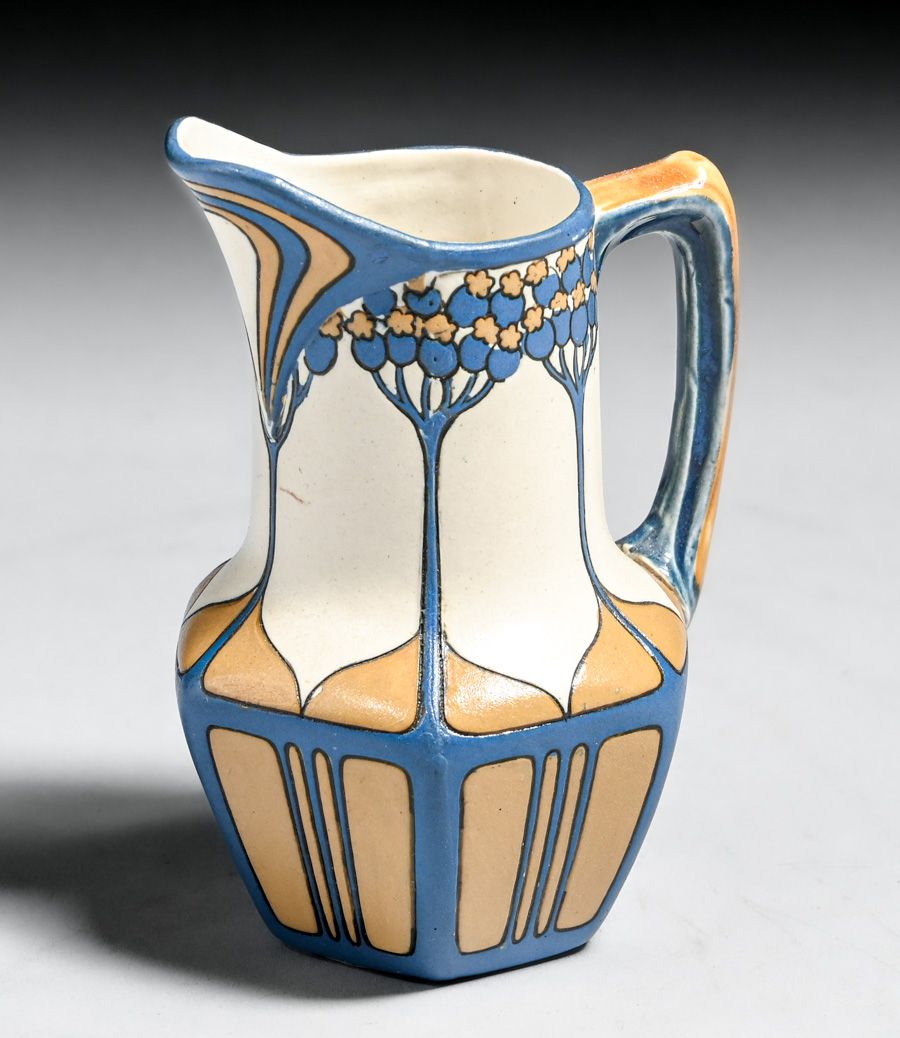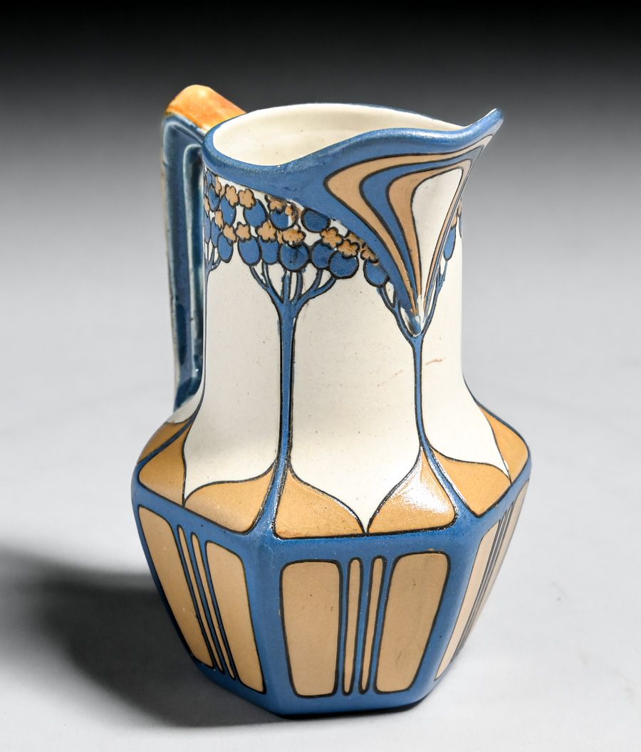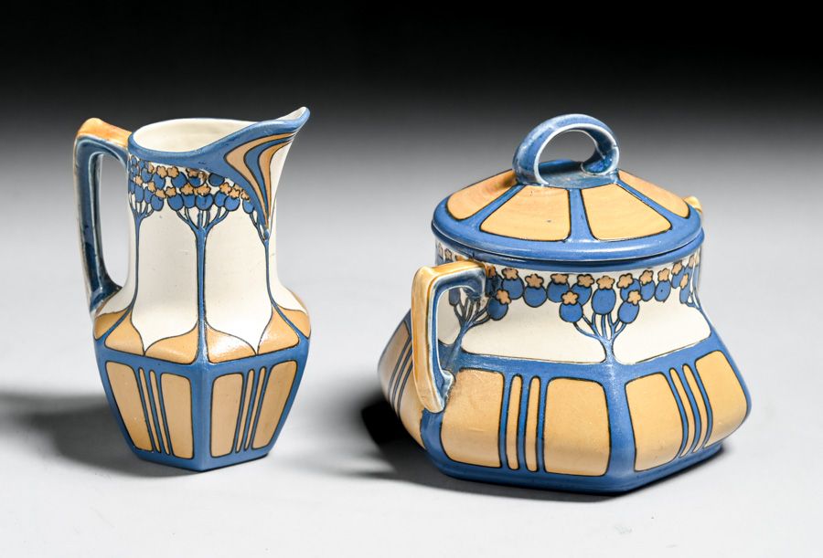 Metlach Pottery - German Arts & Crafts Sugar & Creamer Set c1910. Signed. Invisible professional restoration to a few small edge chips. Creamer 4.5"h x 3.25"w. Sugar 5"w x 4.25"h SOLD