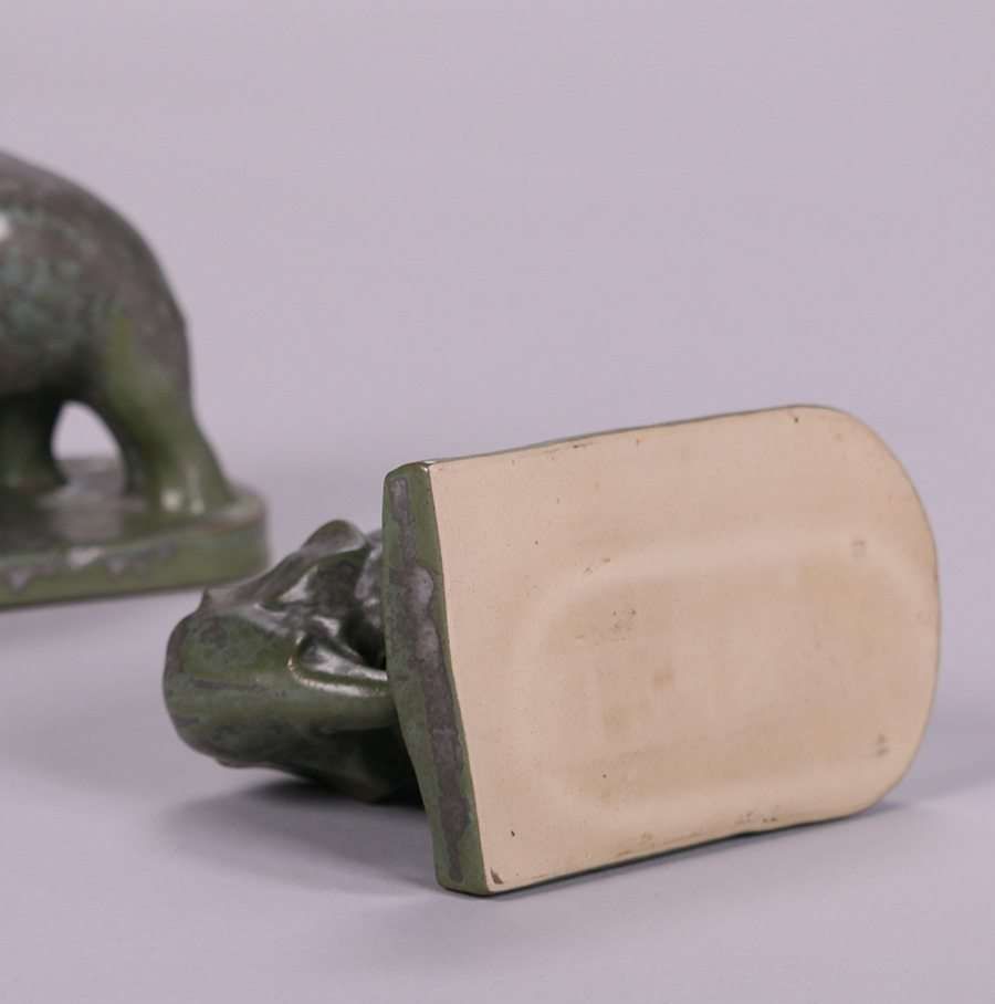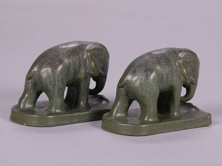Monmouth Pottery elephant bookends with exquisite green micro-crystalline glaze. Unsigned. Small base chip professionally repaired, otherwise perfect. 6″w x 4.25″h x 3.5″ SOLD