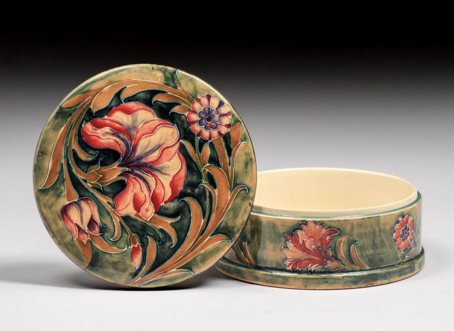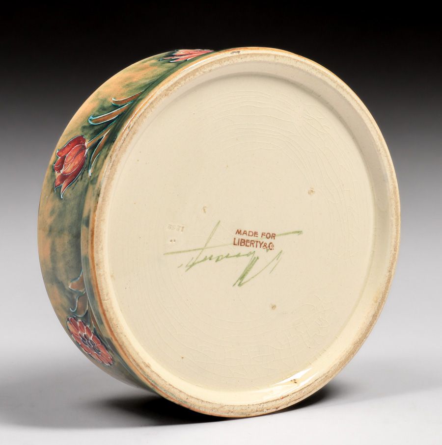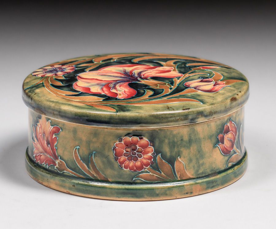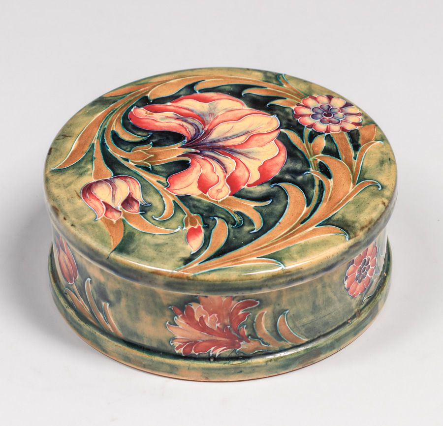 Moorcroft - Liberty & Co #1252 Pansy Box c1900s. Signed. Perfect condition. 6.25"d x 2.5"h SOLD