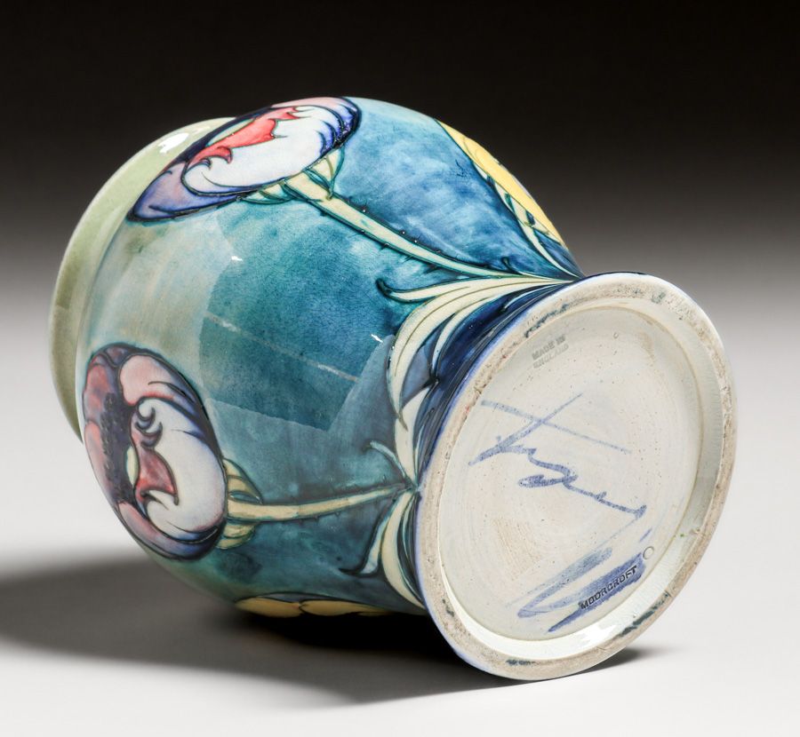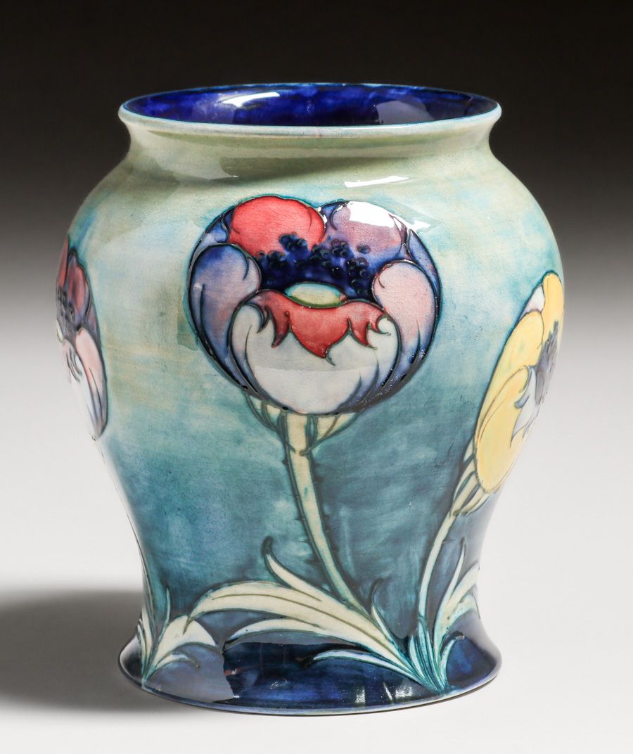 Moorcroft Pottery Poppy Vase c1920s. Signed. Invisible professional restoration to rim chip, otherwise perfect condition. 7 5/8″h x 6.25″d SOLD