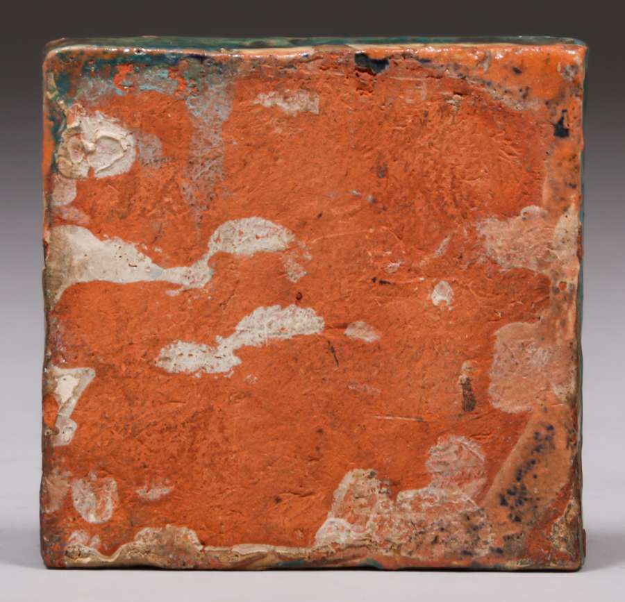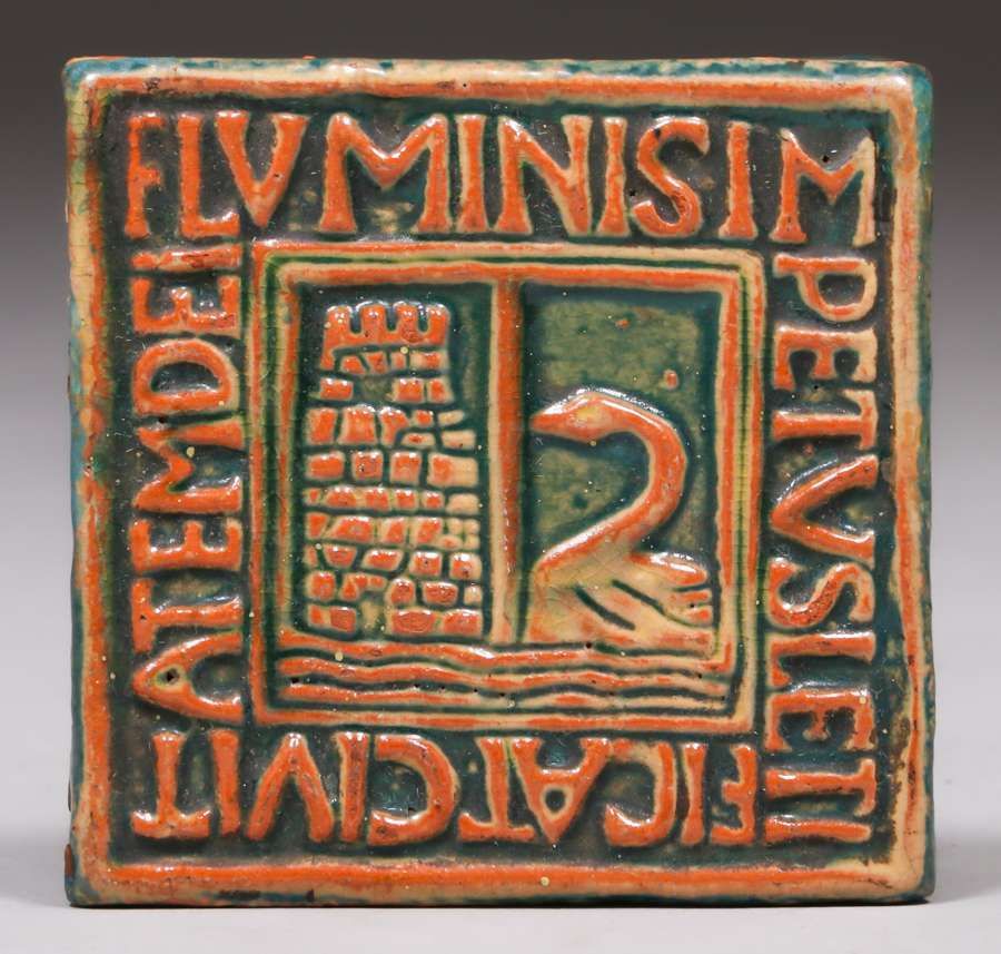 Moravian Pottery Castle & Swan Tile c1920s. Unsigned. Perfect condition. 4" x 4" SOLD
