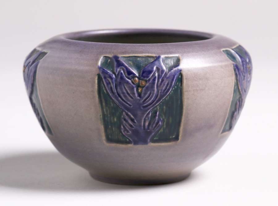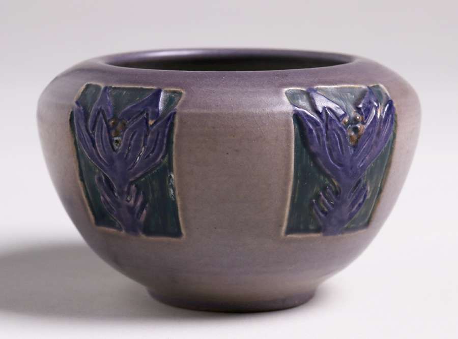 North Dakota School of Mines carved closed bowl. Tight line in base, otherwise perfect condition. Very nice carved form. 5.25"d x 3.5"h SOLD